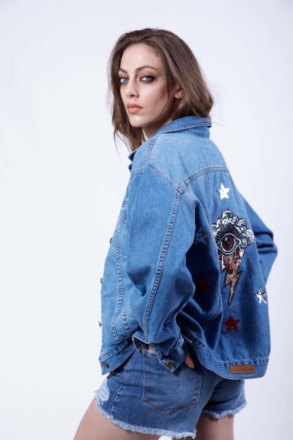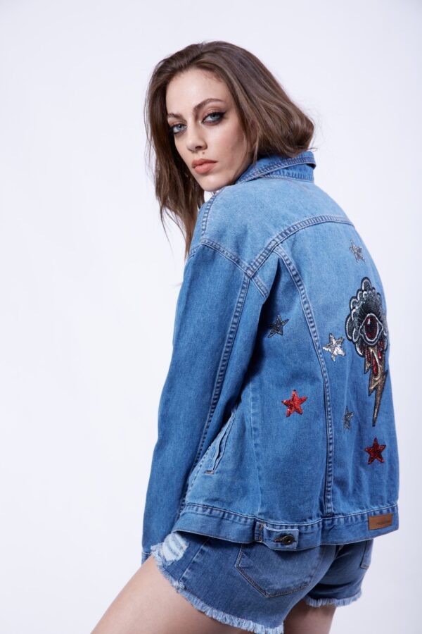 Calce oversize con apliques de lentejuelas colocados artesanalmente y botones con logo de marca.