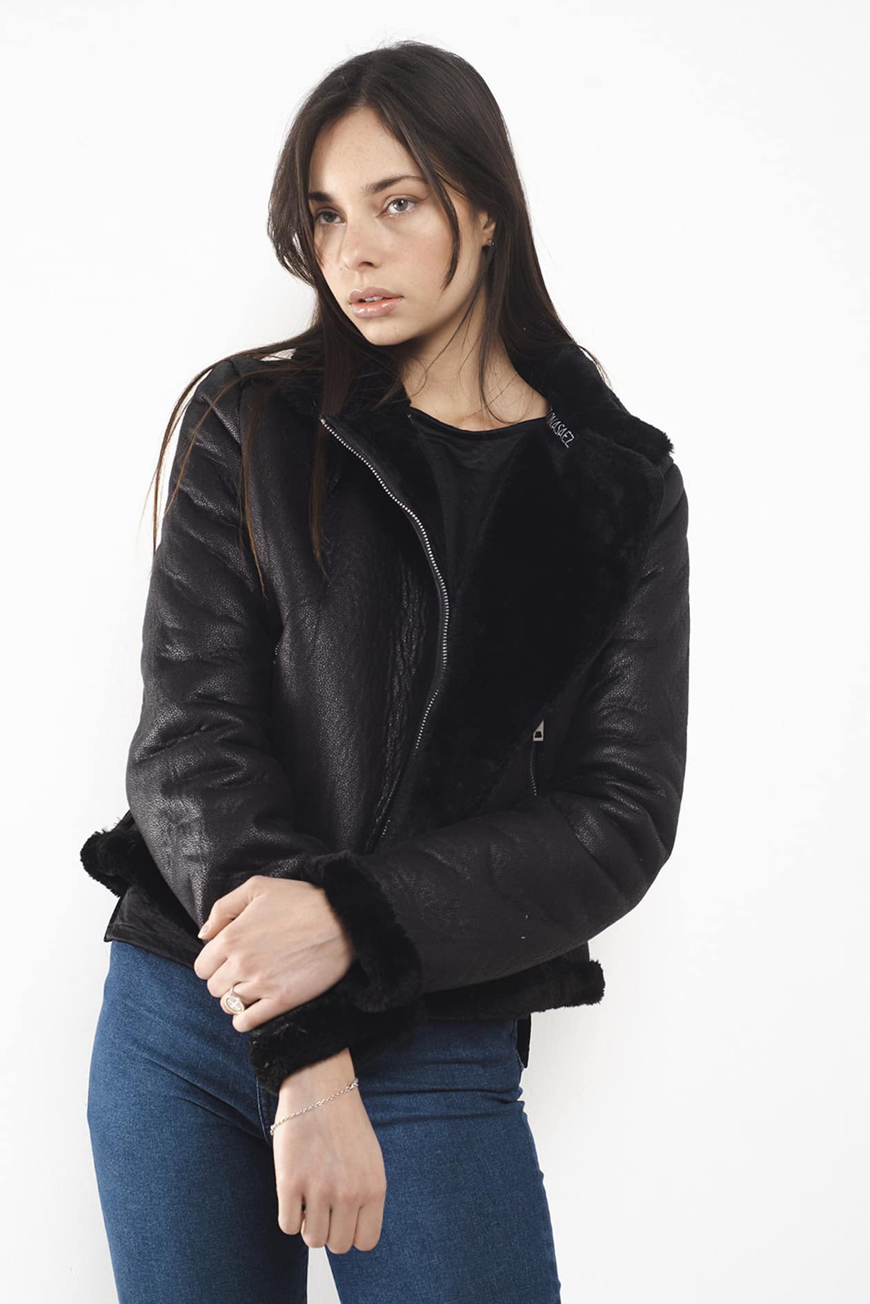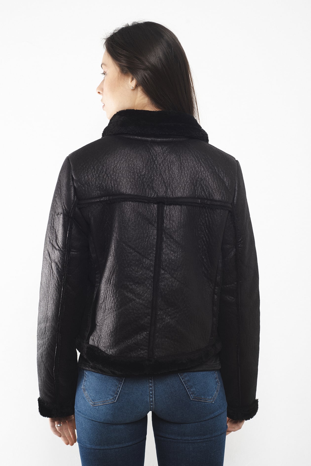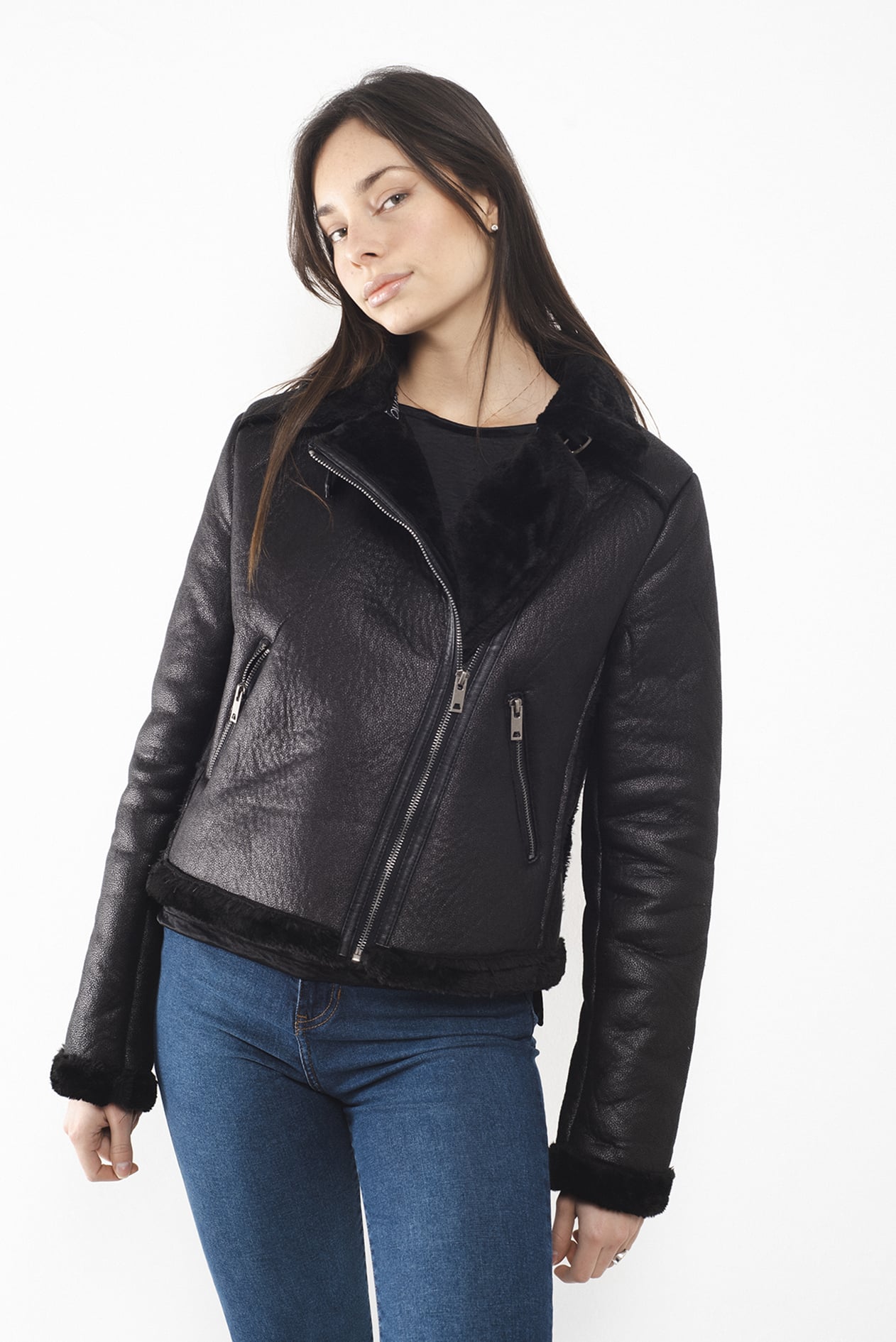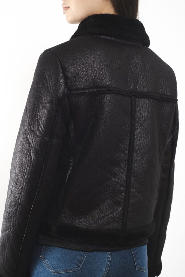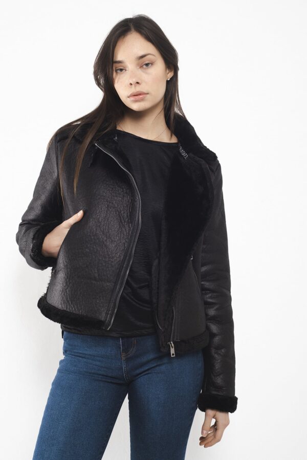 Campera corta con cuello alto confeccionada en simil corderito color negra