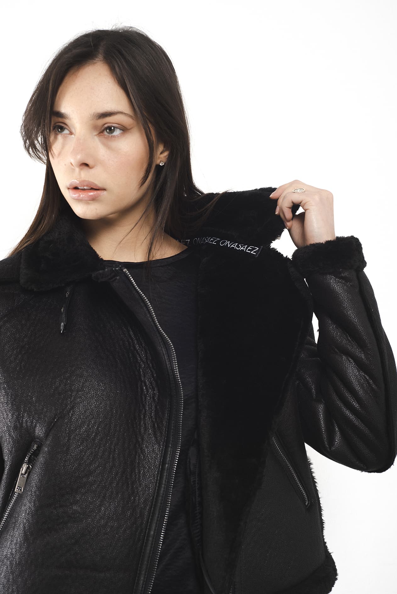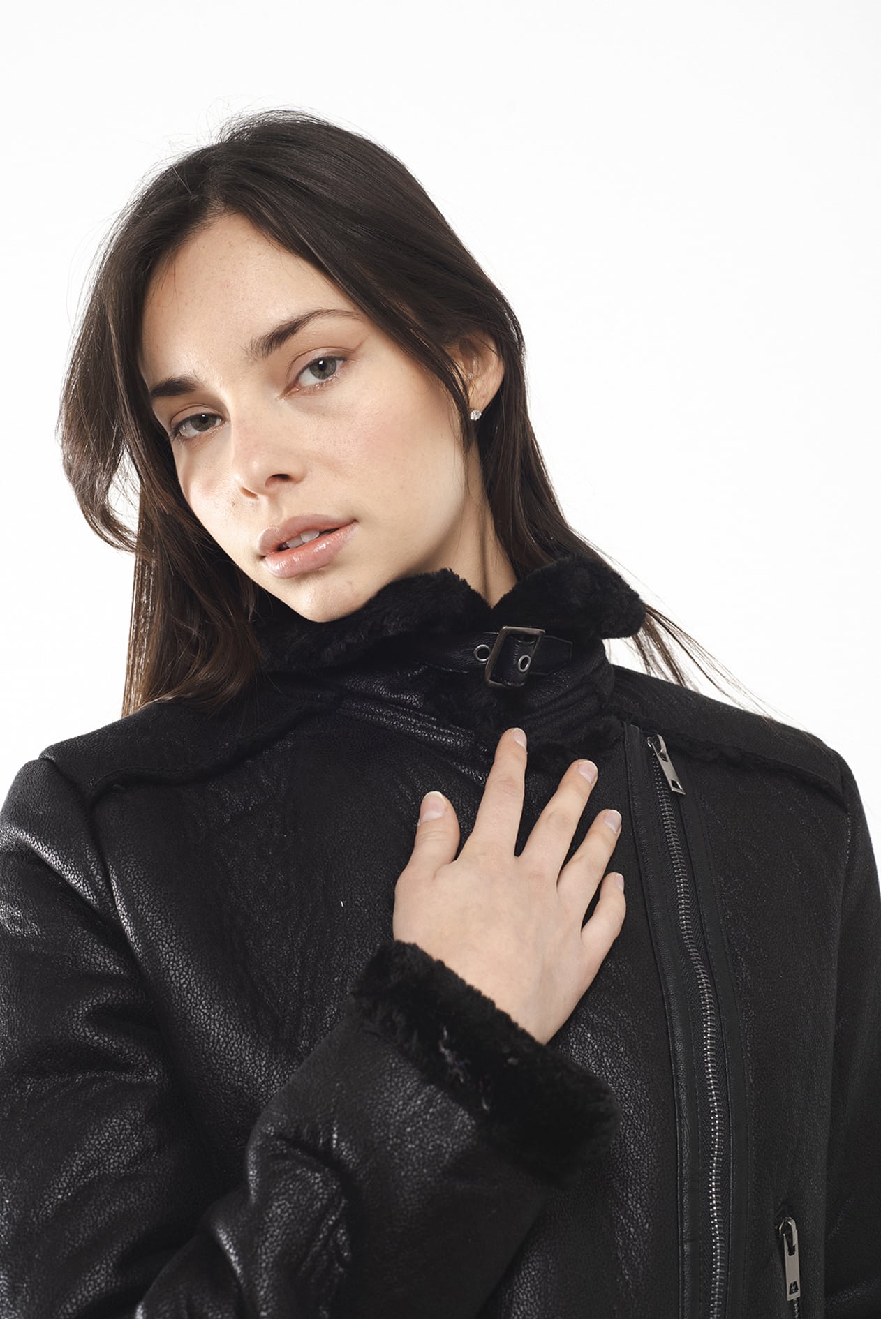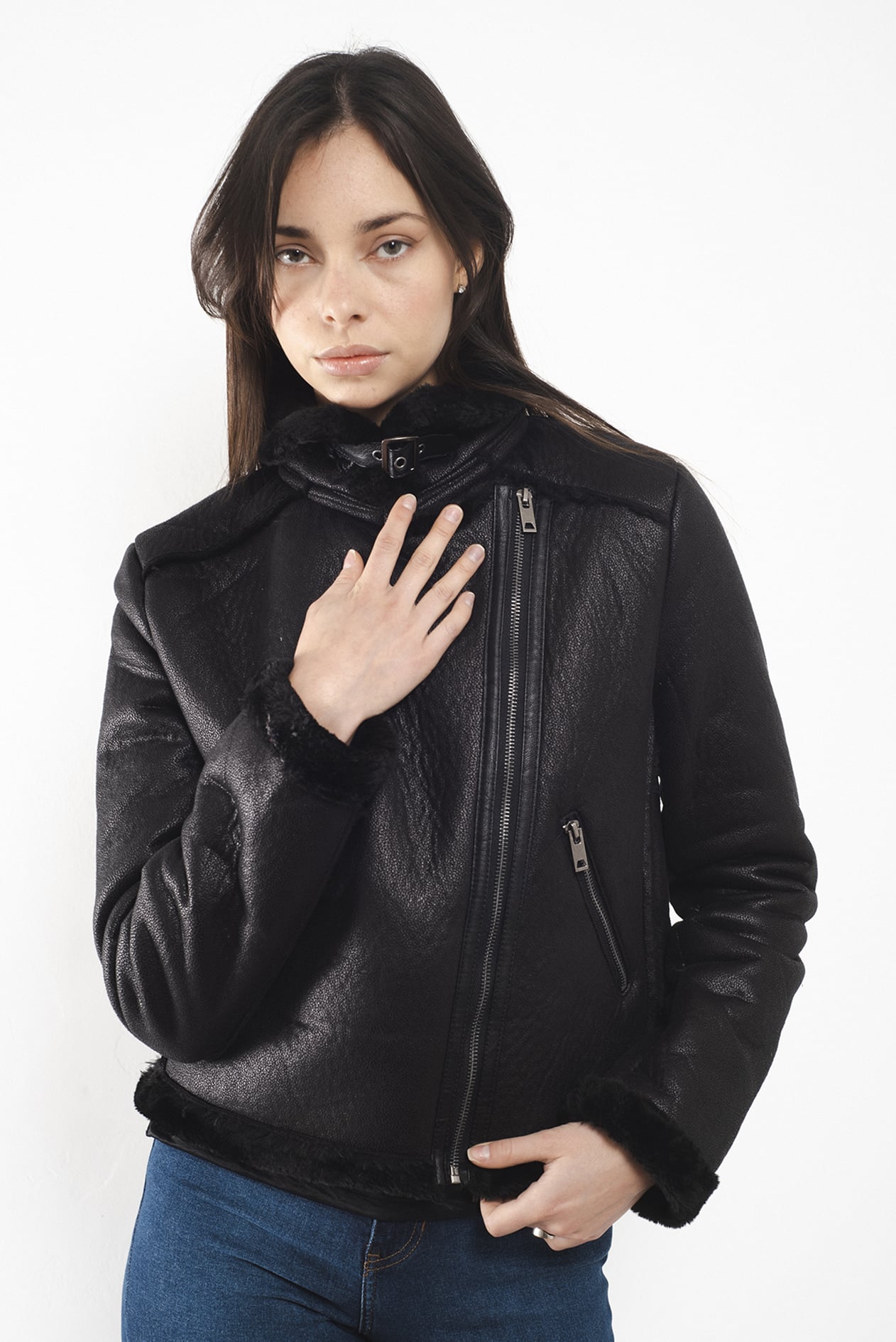 Campera corta con cuello alto confeccionada en simil corderito color negra