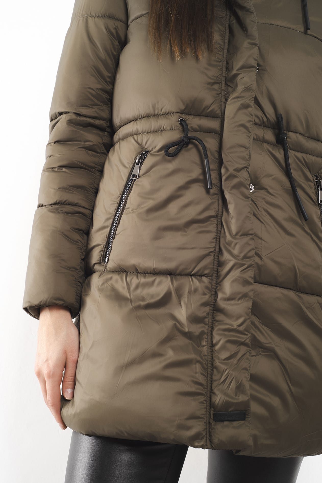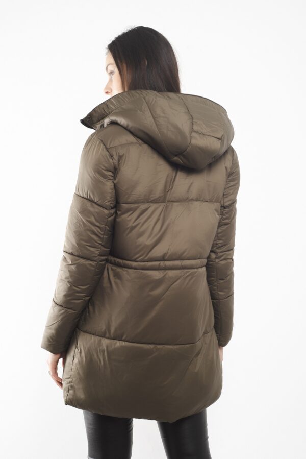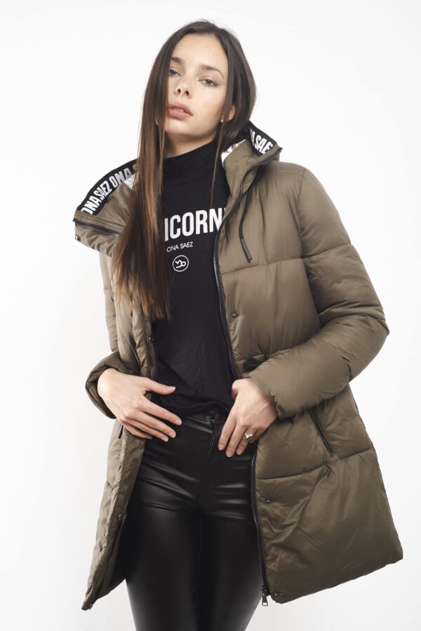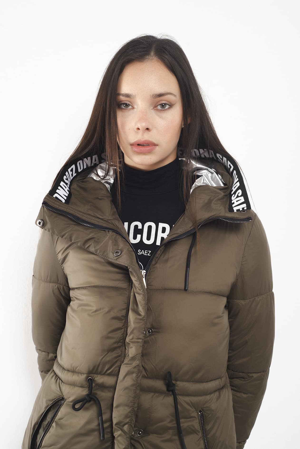 Campera larga tipo puffer, con relleno de vellón siliconado color verde oliva
