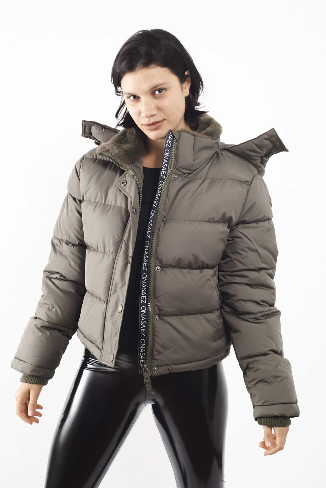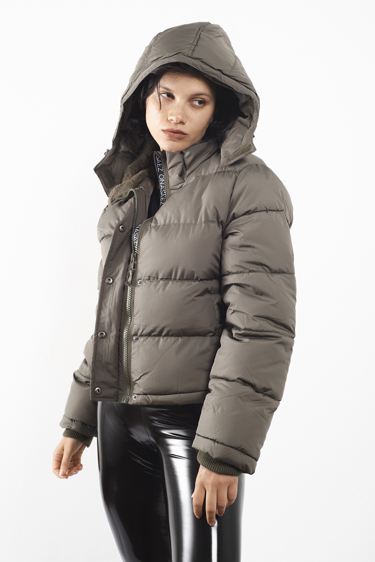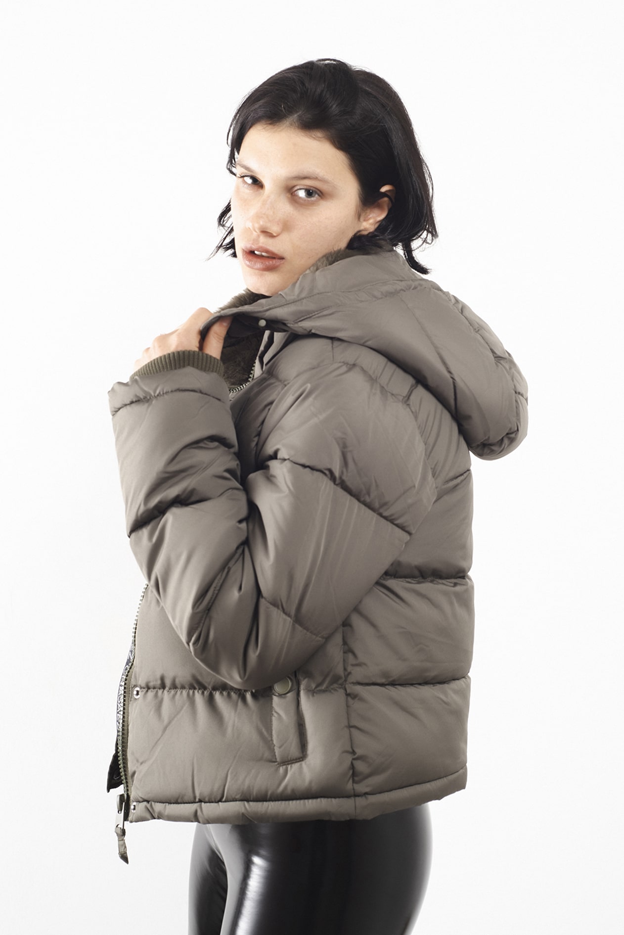 Campera corta tipo puffer, con relleno de vellón siliconado color verde
