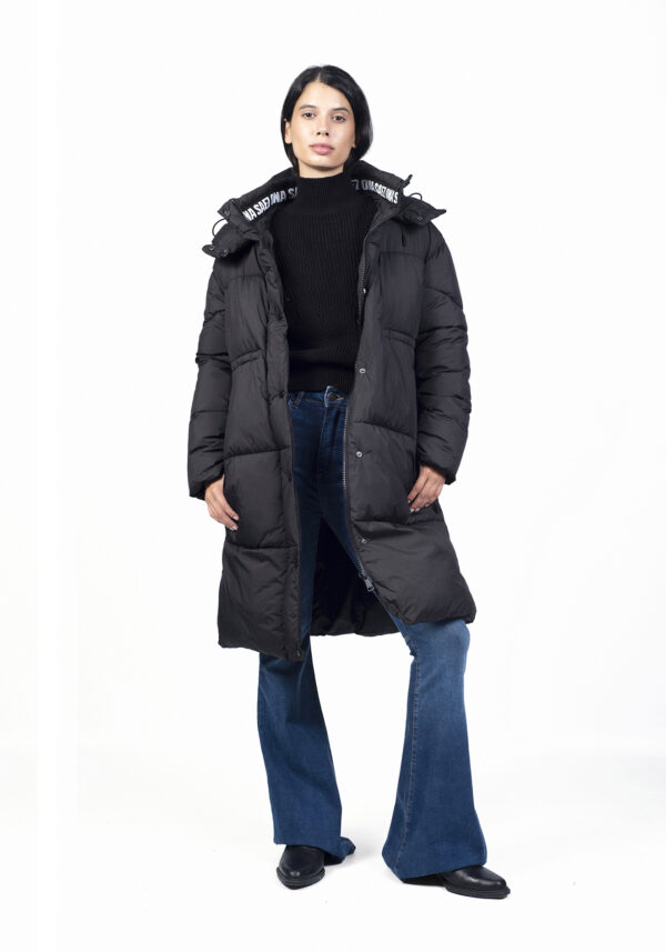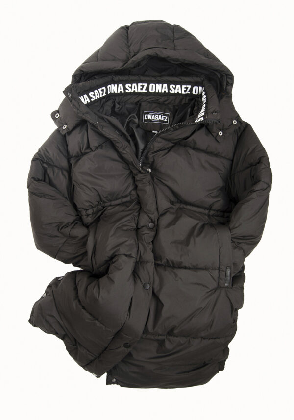 Cuello alto con capucha y cordón elástico y stoppers en la cintura.
