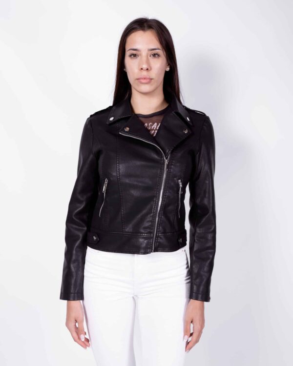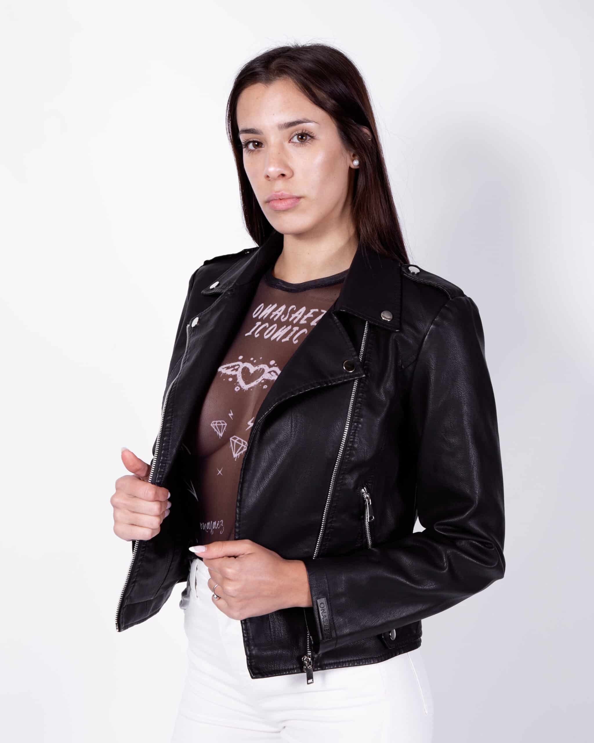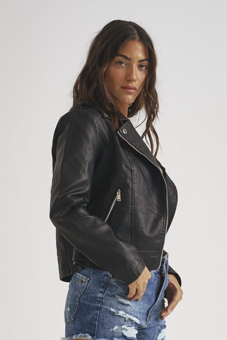 Campera tipo biker entallada, de largo intermedio, confeccionada en pu (simil cuero).