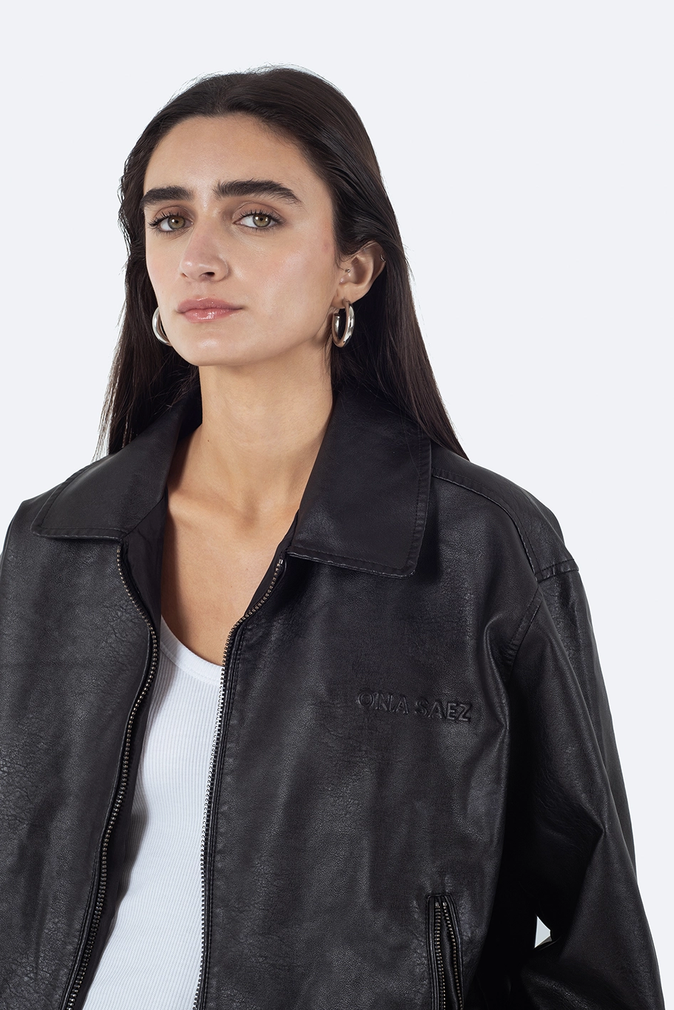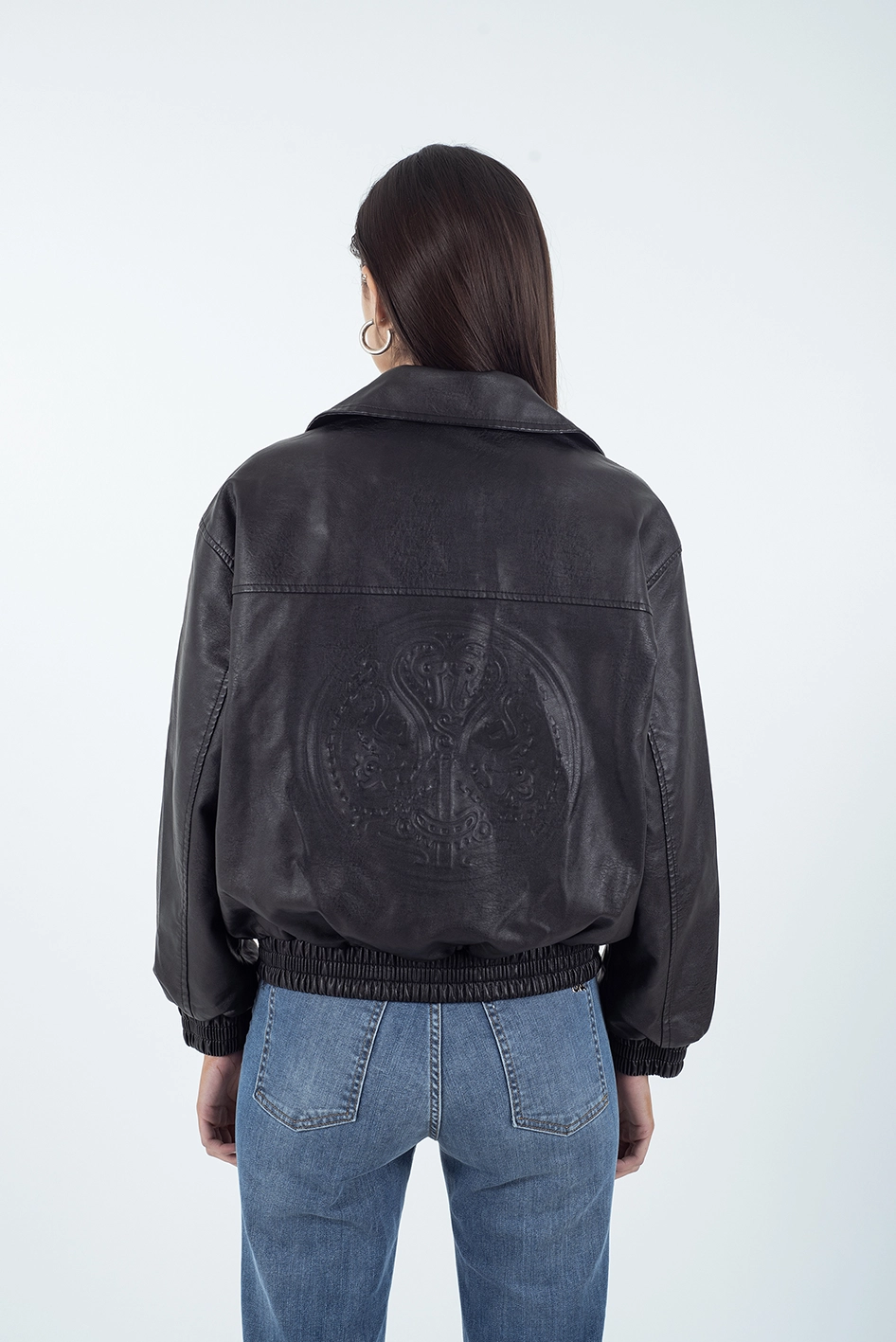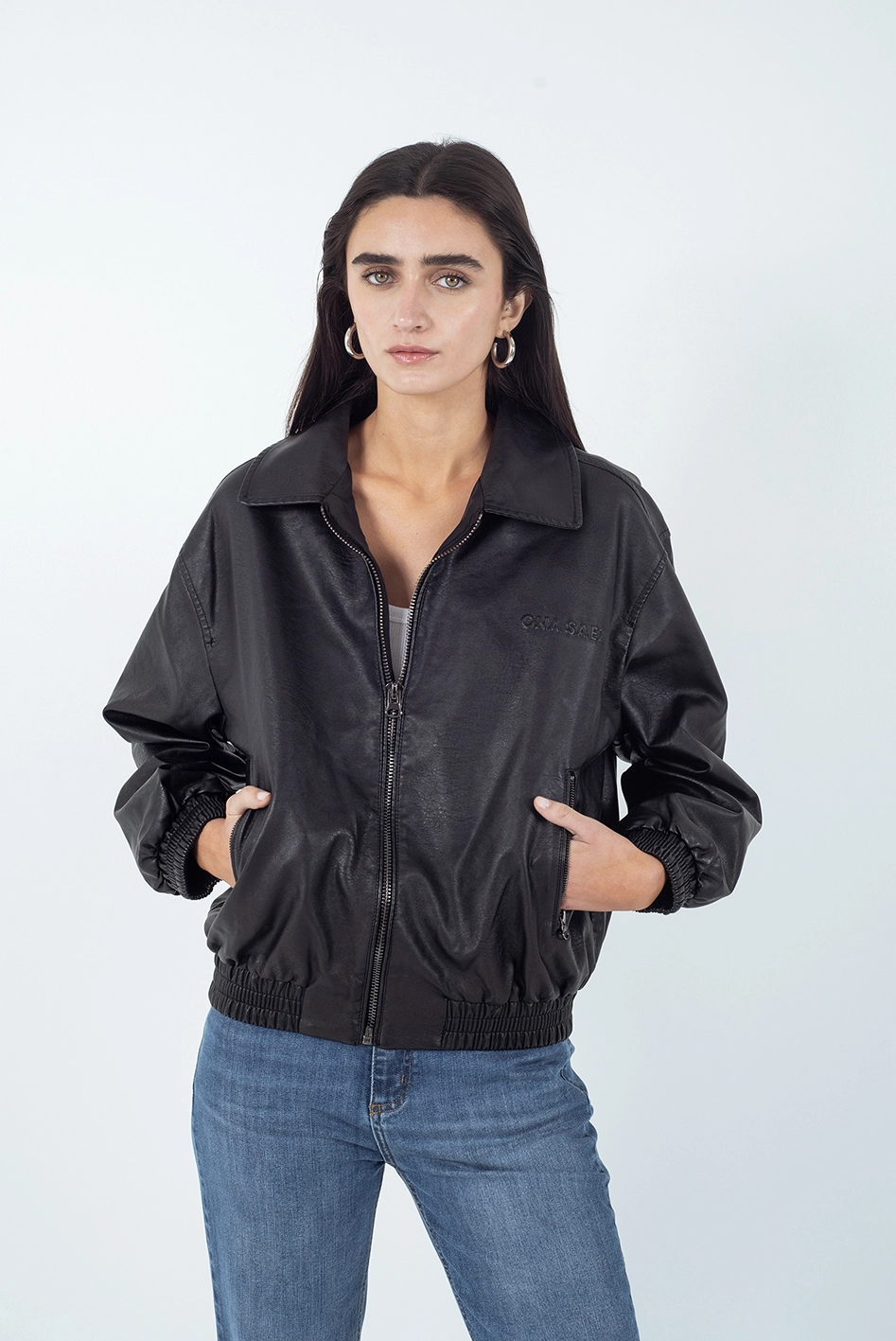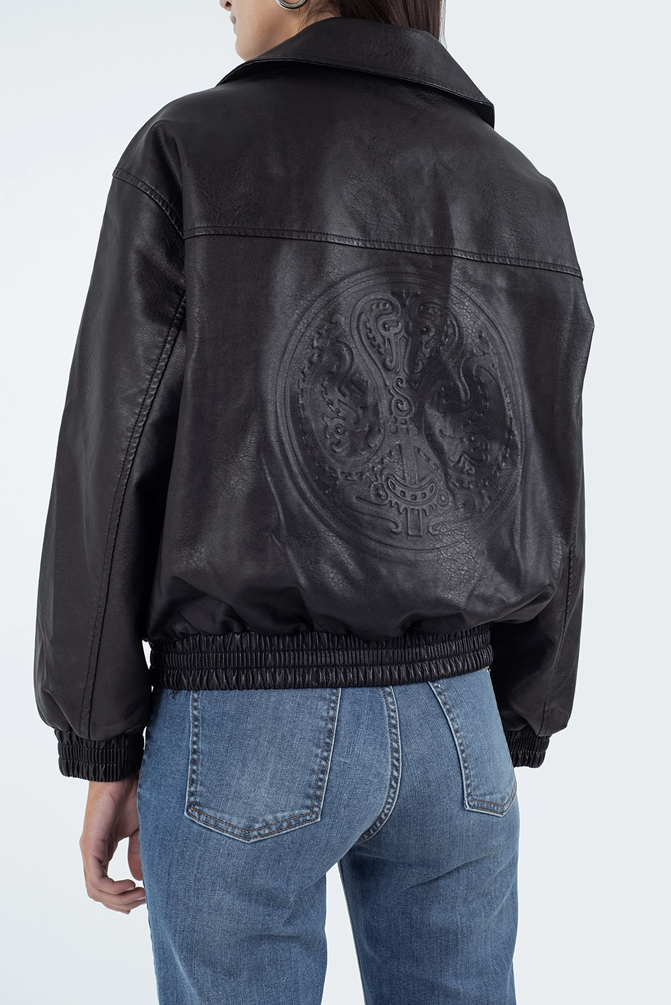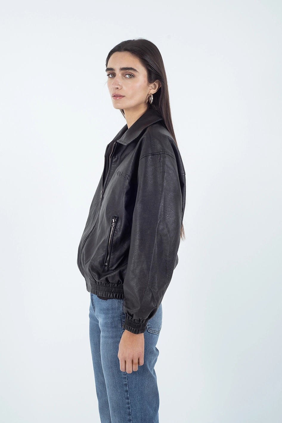 Campera tipo bomber confeccionada en PU (símil cuero), de corte ligeramente oversize.