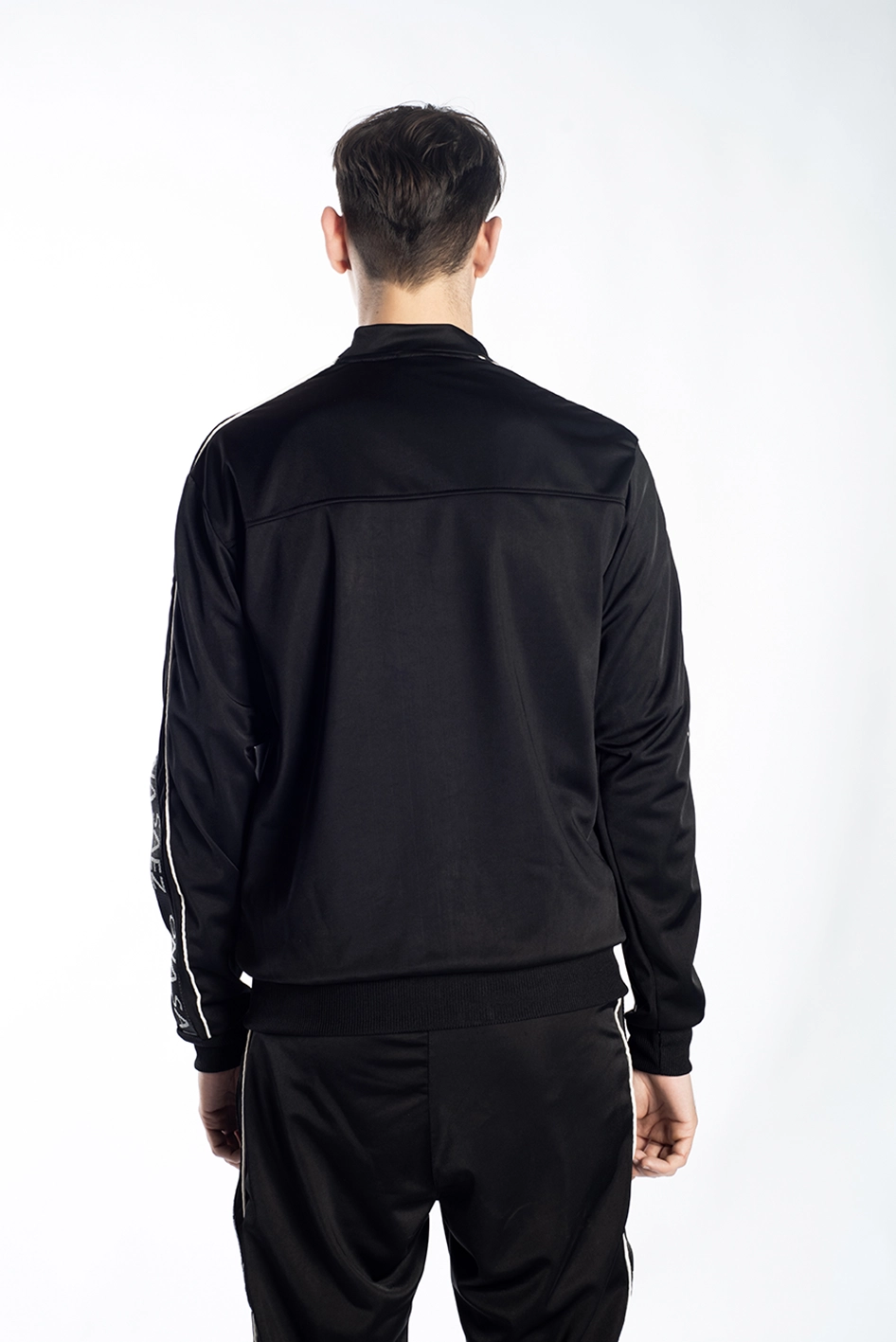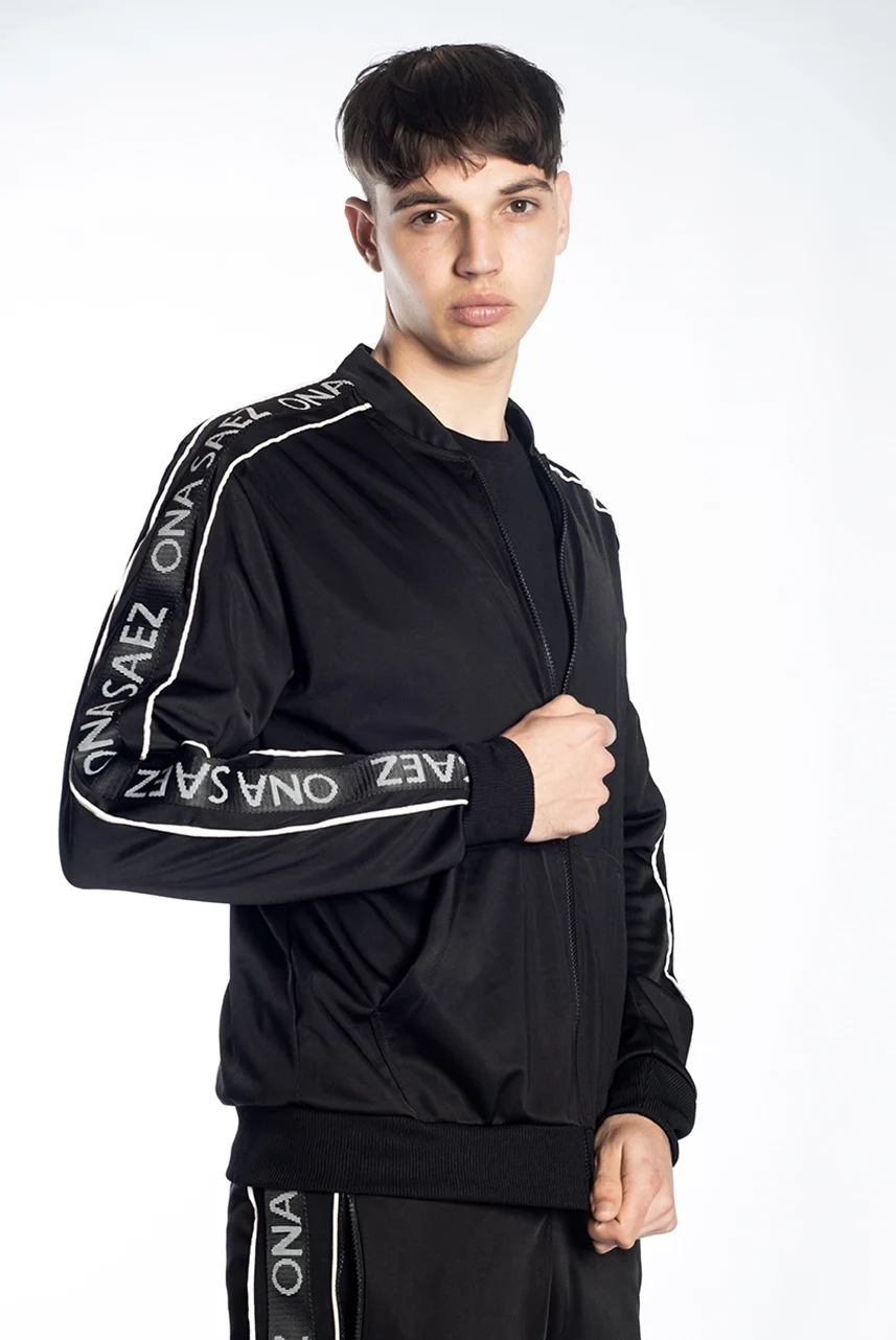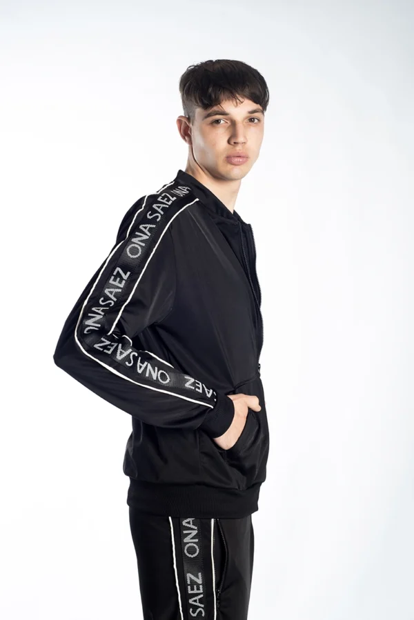 Largo modular por encima de la cadera, con diseño de tiras bordadas con logo de marca a contra tono a lo largo de ambas mangas.