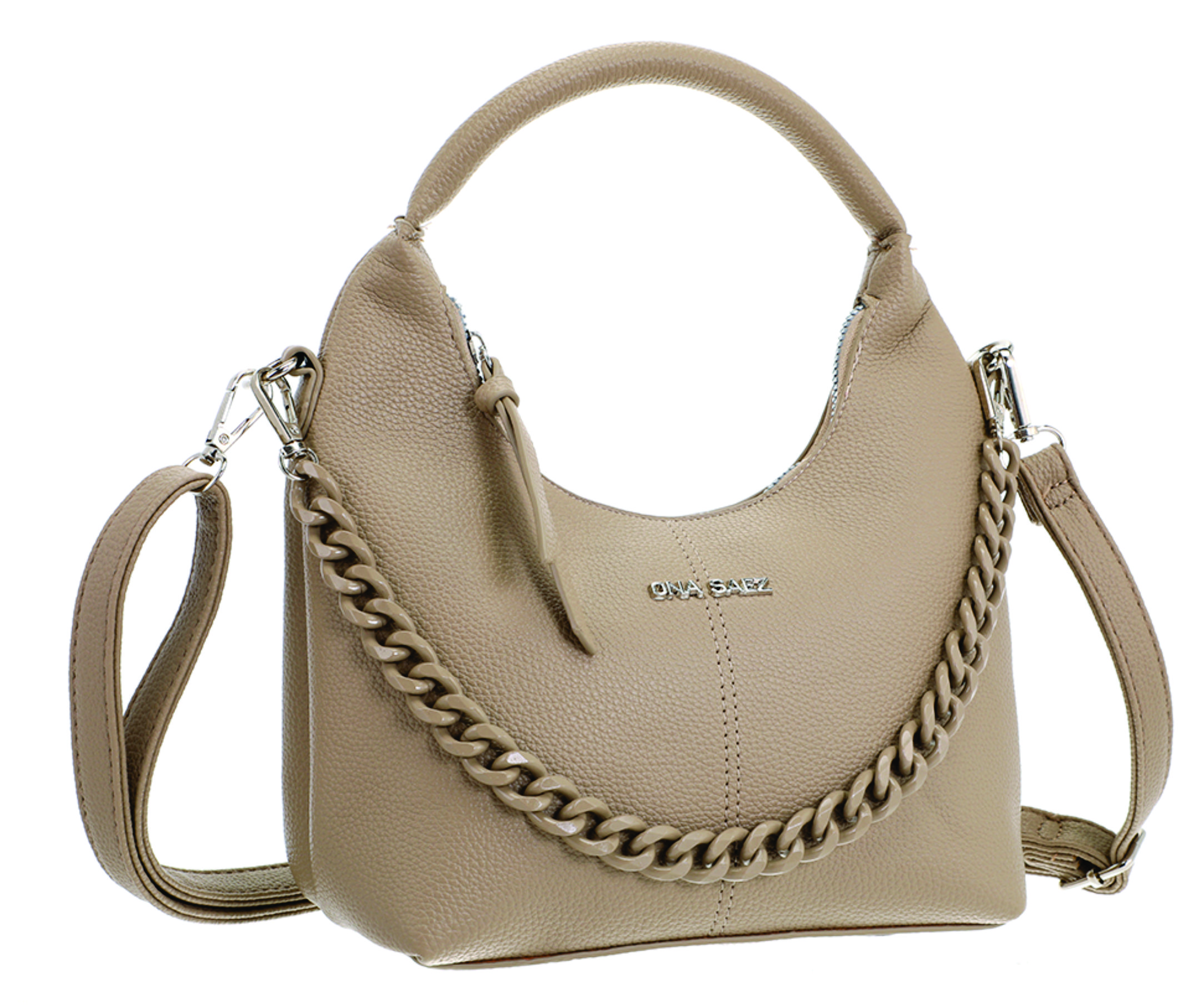 Se destaca por su cadena decorativa al frente en tono al cuerpo y el logo metálico ONA SAEZ aplicado. Cierre superior con cierre metálico y herrajes plateados.