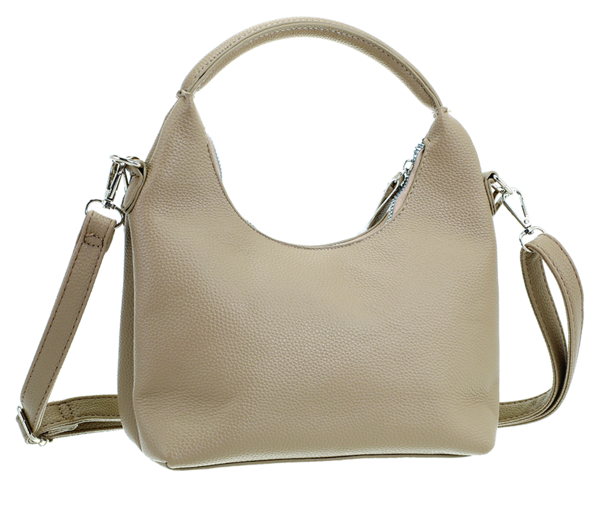 Cartera mediana confeccionada en material símil cuero con textura graneada color Arena. Posee un diseño estructurado con manija superior rígida y correa larga regulable y desmontable, que permite usarla tanto al hombro como cruzada.