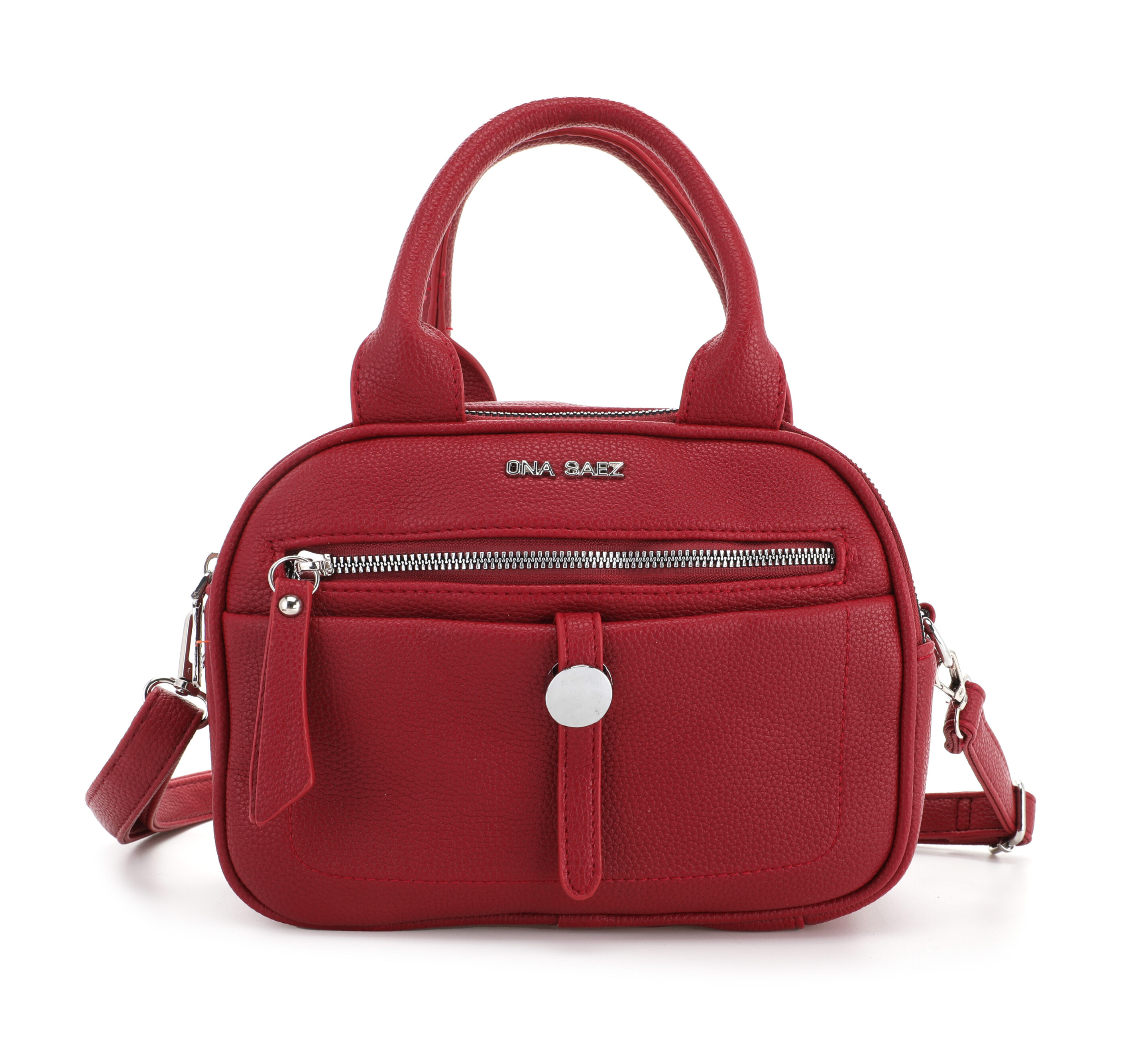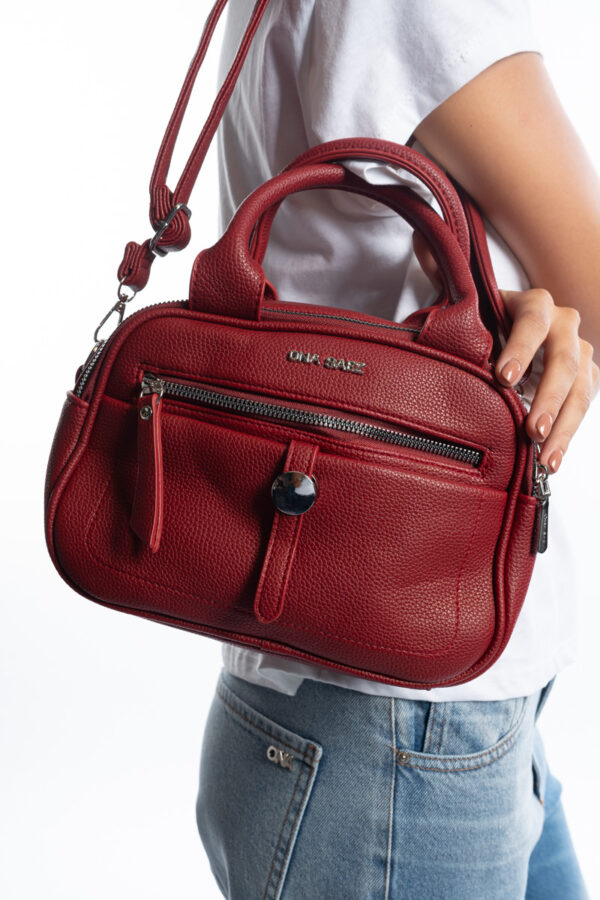 En la parte frontal, cuenta con un bolsillo adicional con el logo de la marca en relieve metálico y doble correa, una corta para mano y una ajustable y desmontable para colgar al hombro.