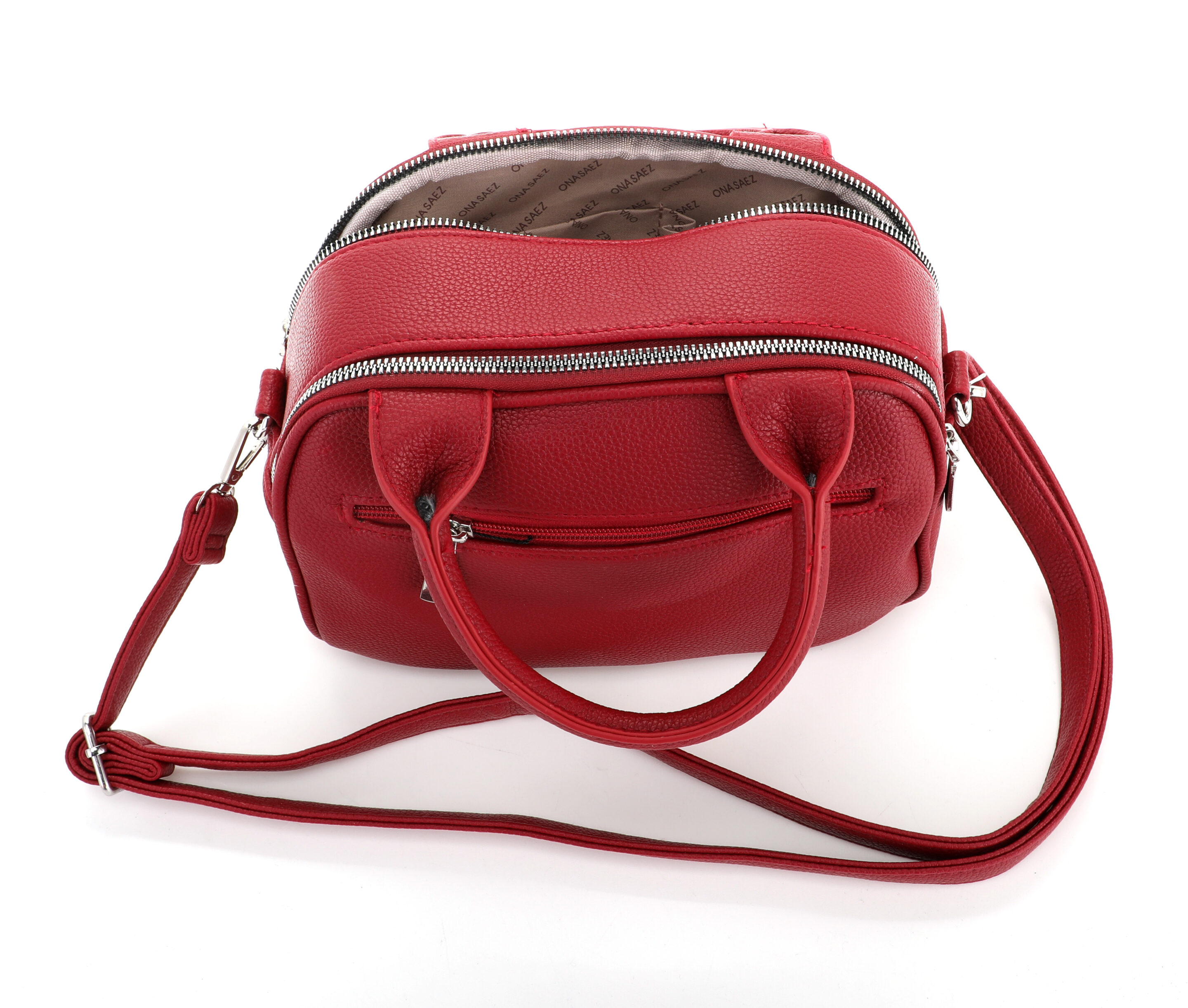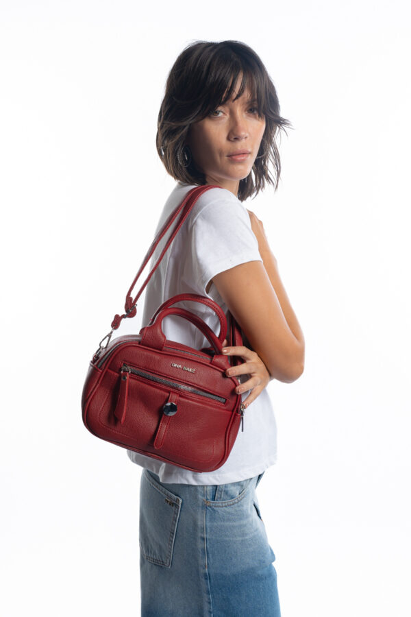 Cartera de tamaño mediano confeccionada en P U (simil cuero) color roja. Tiene un diseño moderno y funcional con múltiples compartimentos con cierre de cremallera, lo que permite una mejor organización.