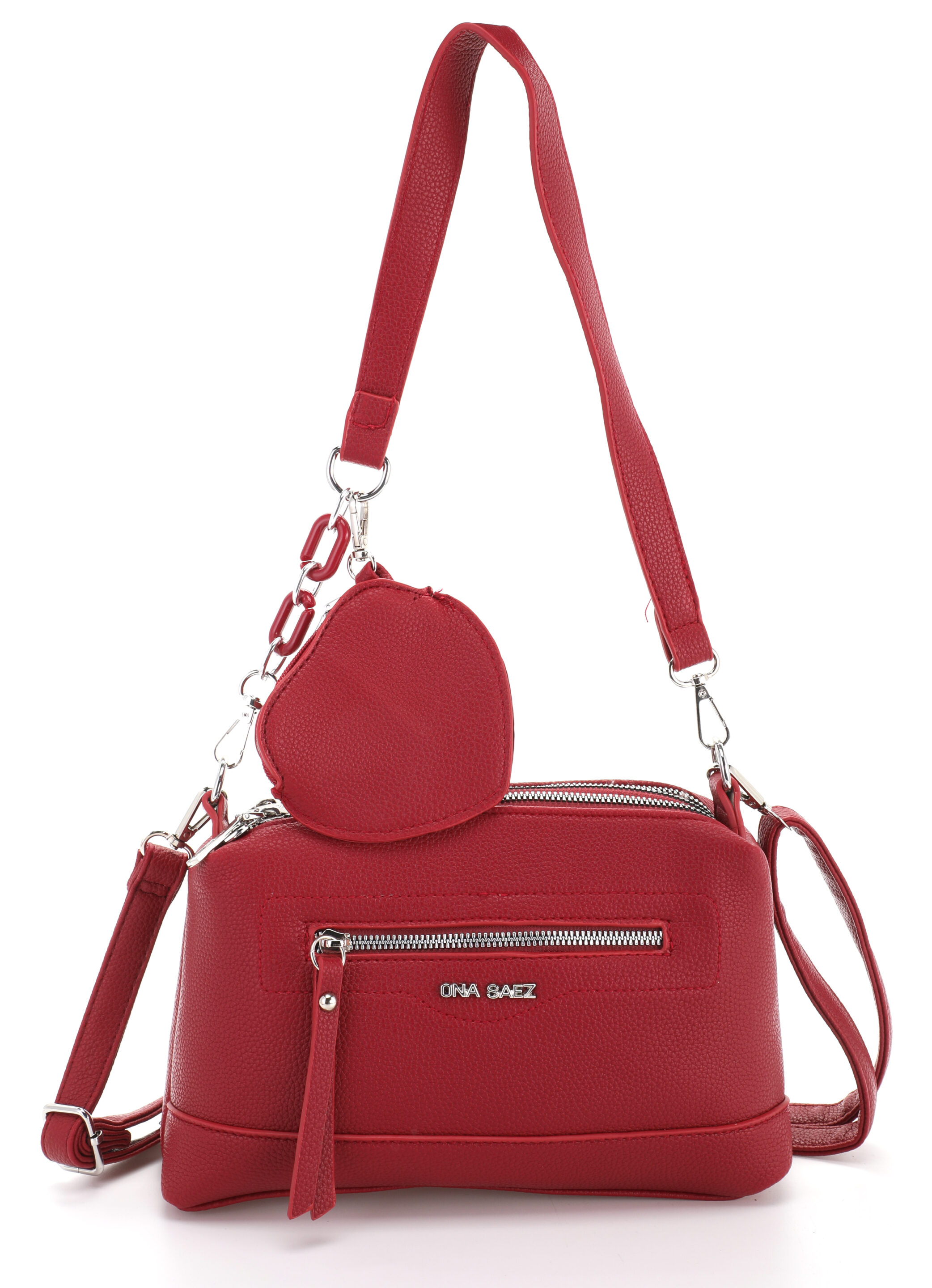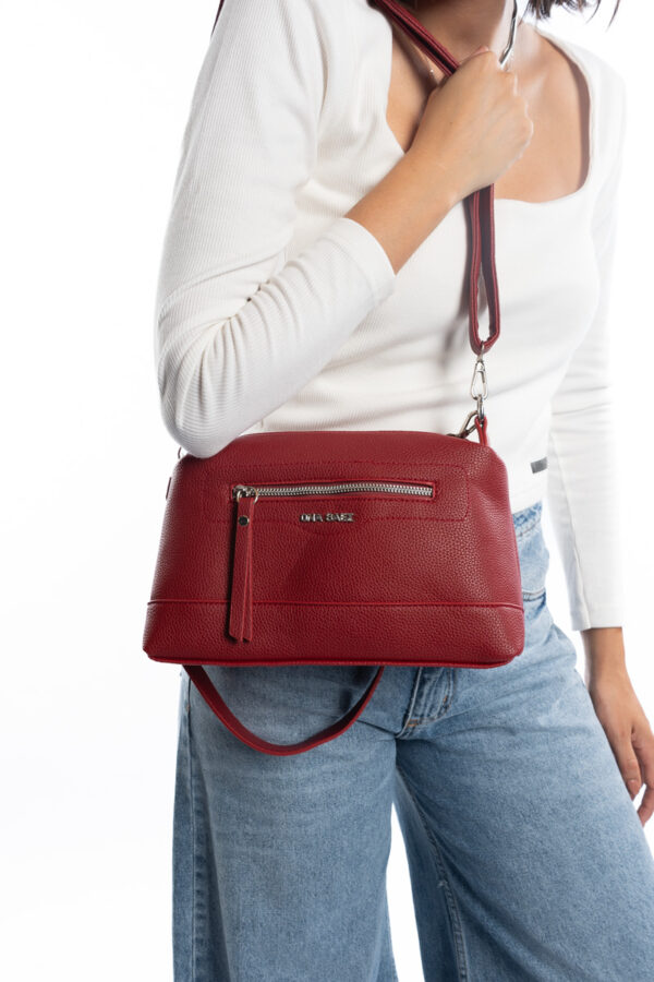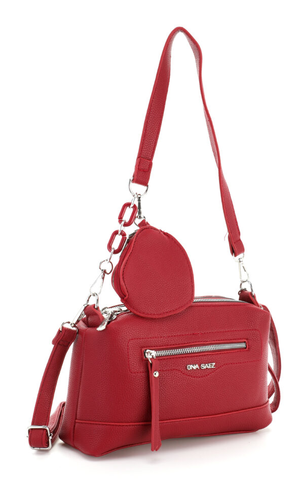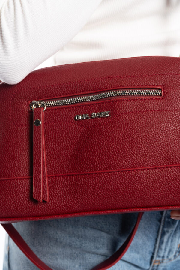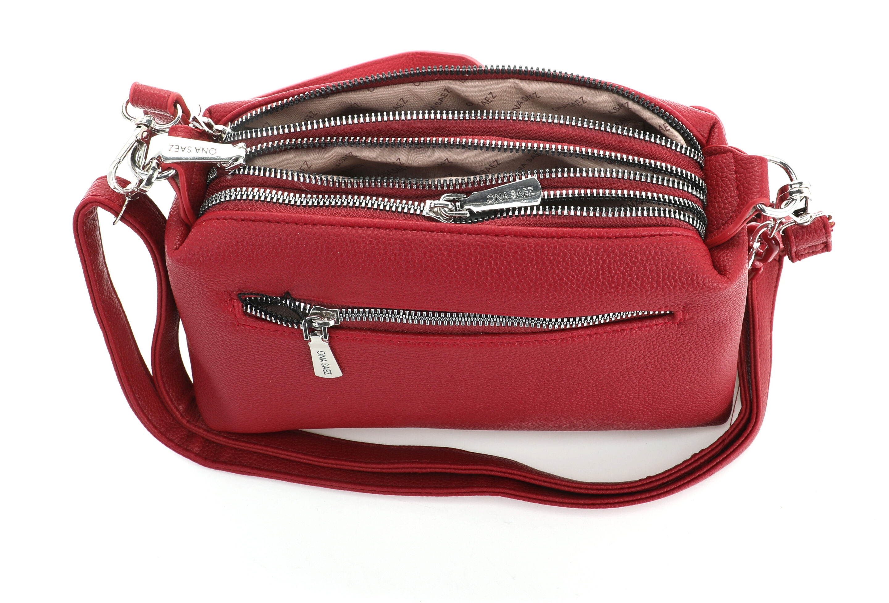 Cartera de tamaño mediano confeccionada en P U (simil cuero) color roja. Tiene un diseño moderno y funcional con múltiples compartimentos con cierre de cremallera, lo que permite una mejor organización.