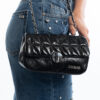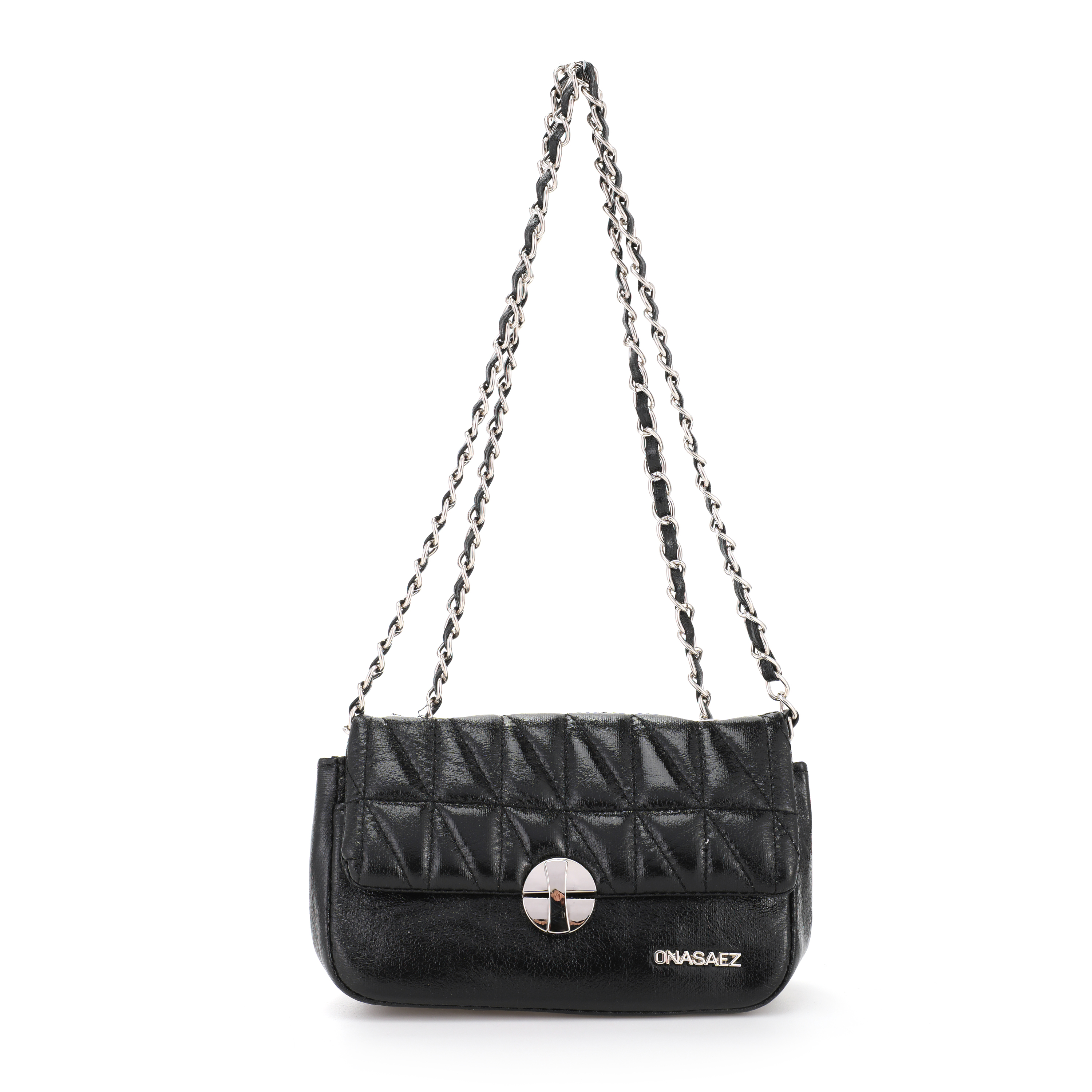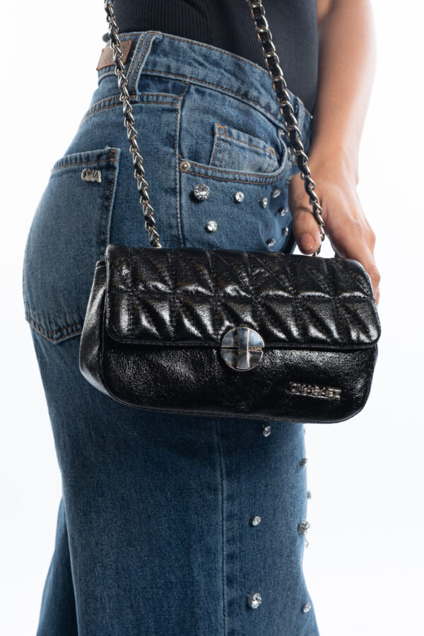 Cartera confeccionada en P U (simil cuero) color negra con acabado metálico, su diseño presenta un efecto acolchado con patrón geométrico, lo que le aporta un estilo sofisticado y moderno.