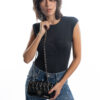 Sistema de apertura con cierre y solapa, y doble correa de cadena para colgar al hombro.