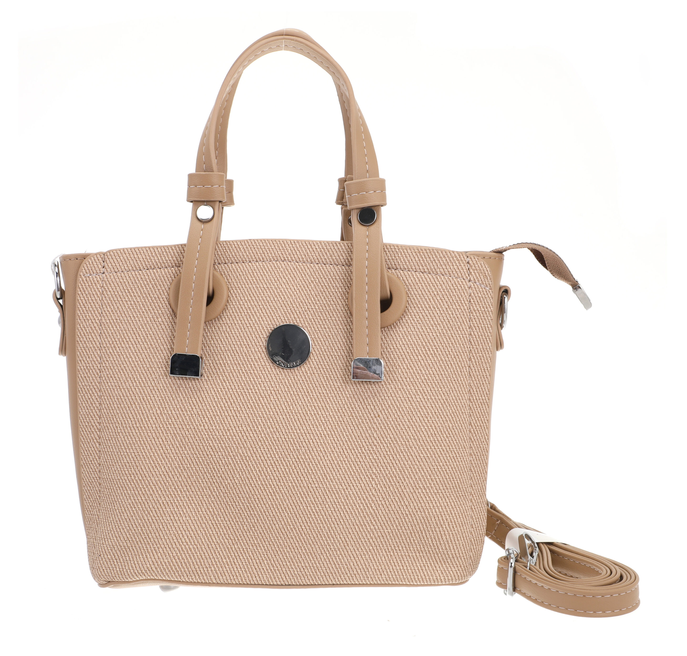 El frente se realza con un aplique metálico circular con logo ONA SAEZ y herrajes en tono plateado que le otorgan un acabado sofisticado.