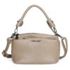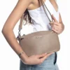 Cartera tipo hobo bag confeccionada en material símil cuero con textura graneada. Presenta un diseño minimalista y elegante, con manija superior curva de formato tubular y detalles de nudos decorativos que aportan un toque moderno.