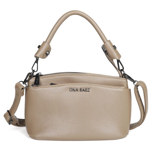 Posee cierre superior metálico y logo ONA SAEZ aplicado al frente en tono plateado.