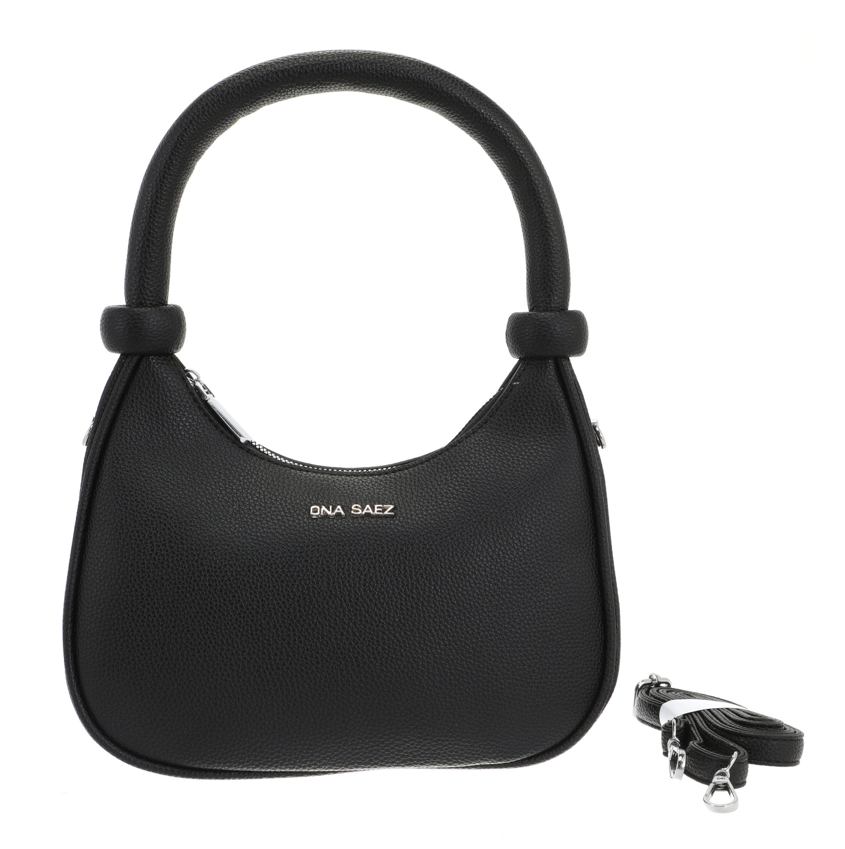 Posee cierre superior metálico y logo ONA SAEZ aplicado al frente en tono plateado.