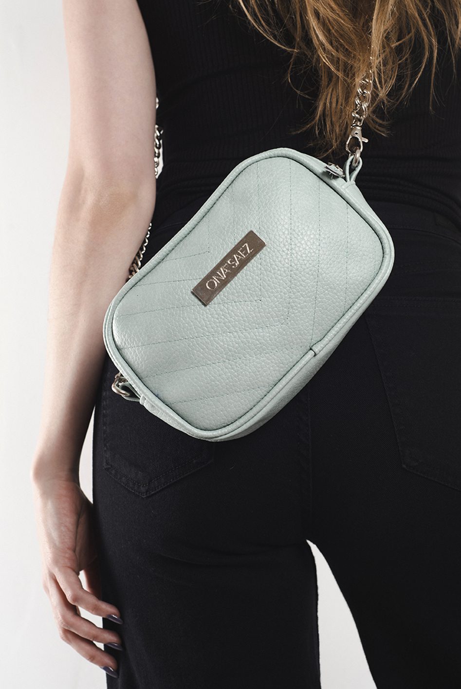 Bandolera confeccionada en pu graneado color verde agua (cuero vegano).