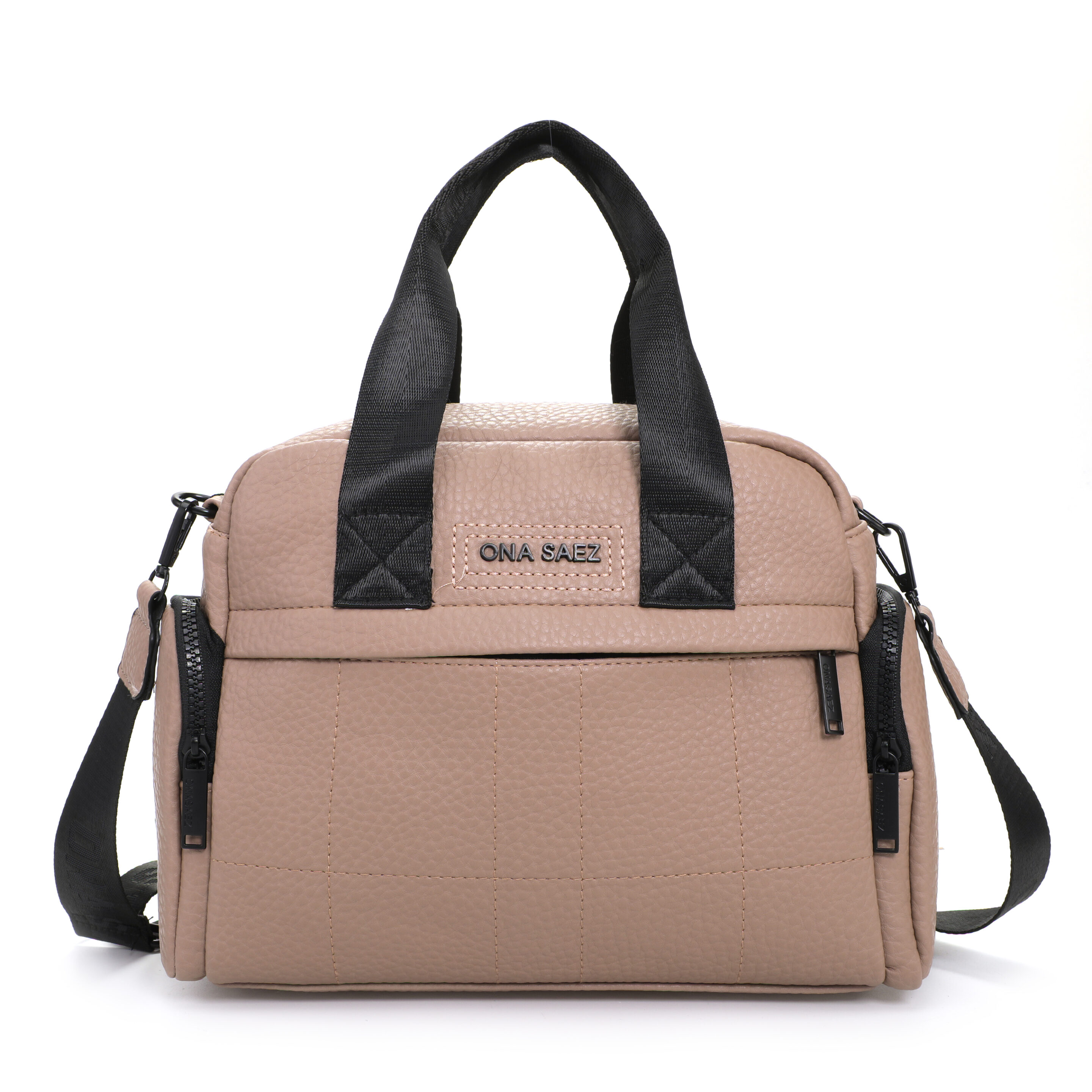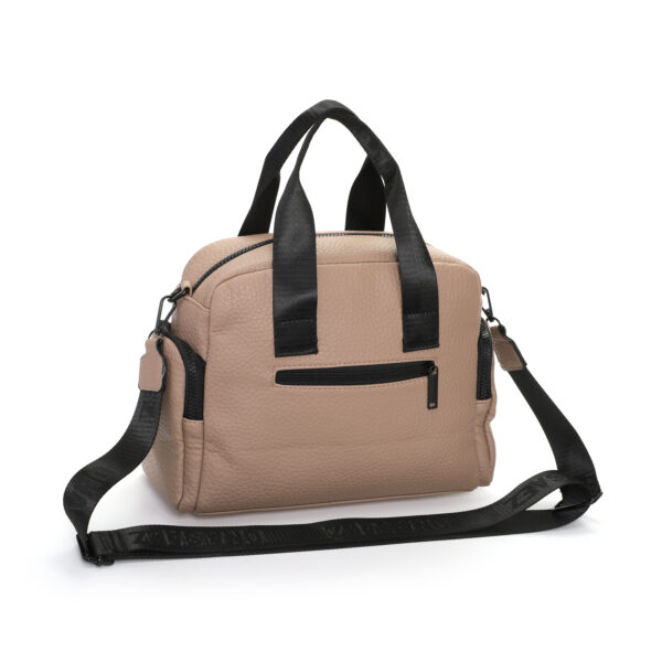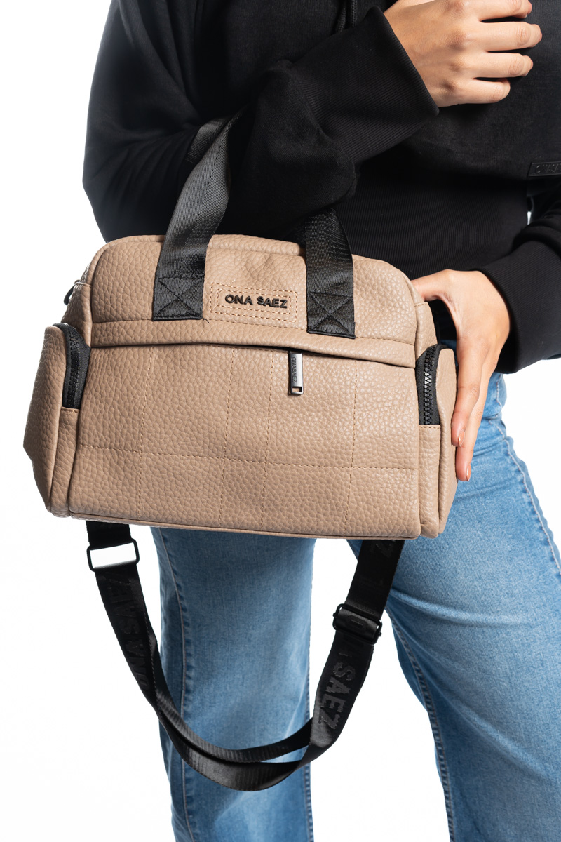 Cartera confeccionada en P U (simil cuero) color arena, con aplique metálico de logo de marca en el frente.