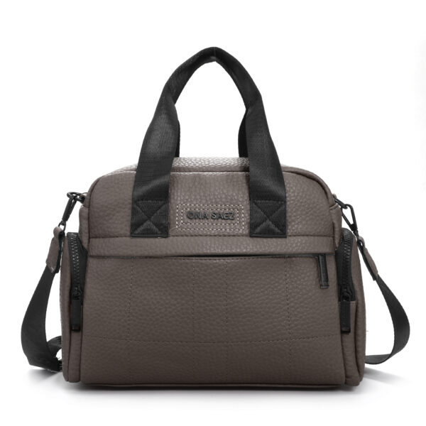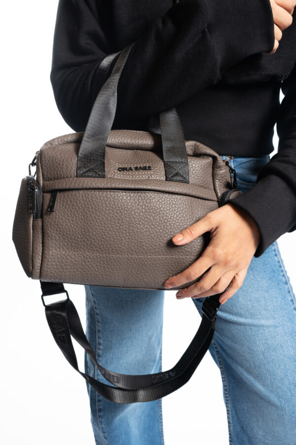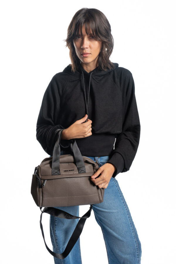 Cartera confeccionada en P U (simil cuero) color cemento, con aplique metálico de logo de marca en el frente.