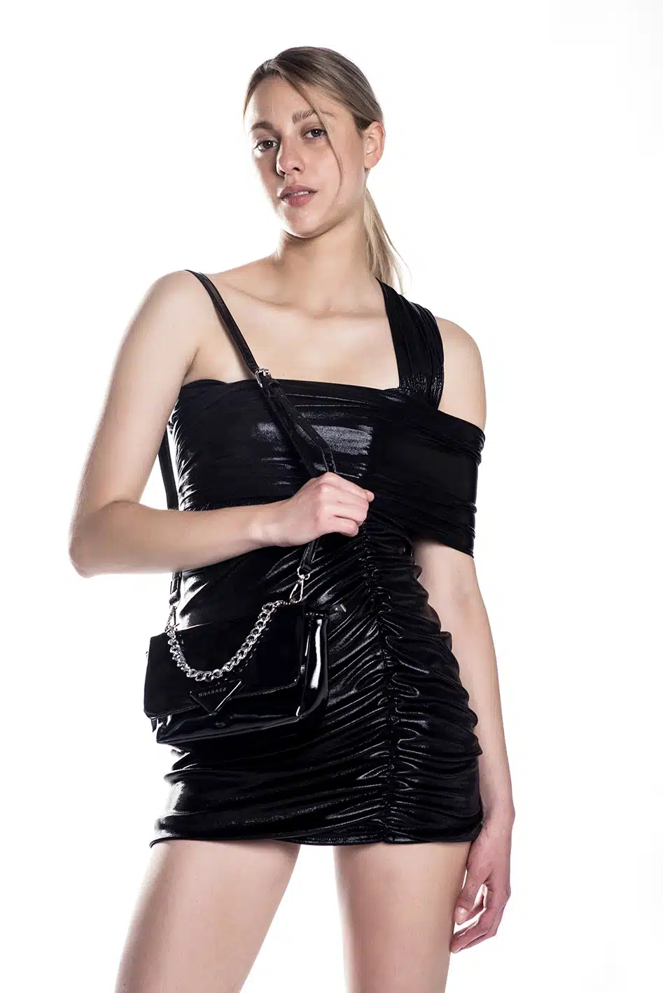 Cartera confeccionada en pu (simil cuero)efecto acharolado color negra, con aplique metalico con logo de marca en el frente.
