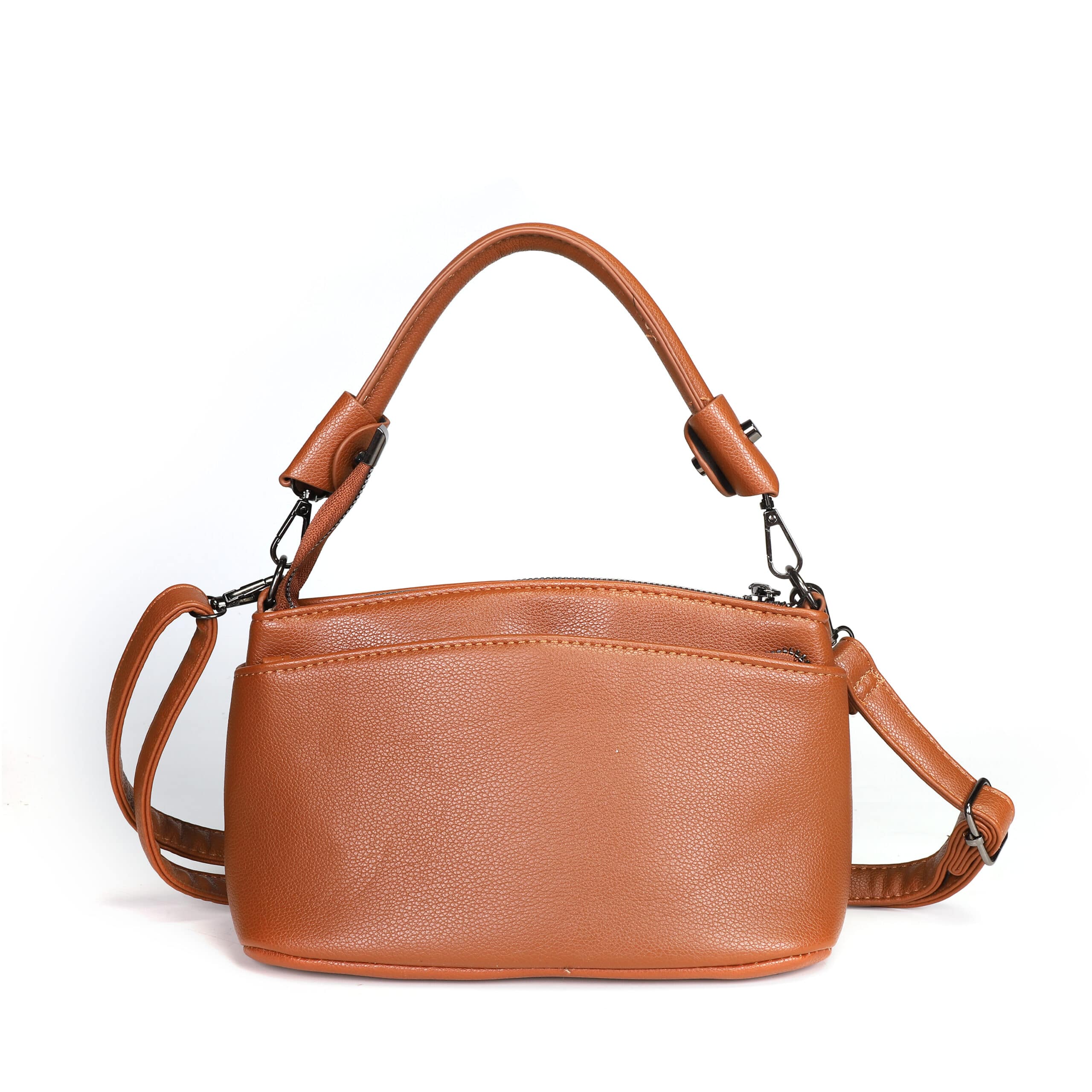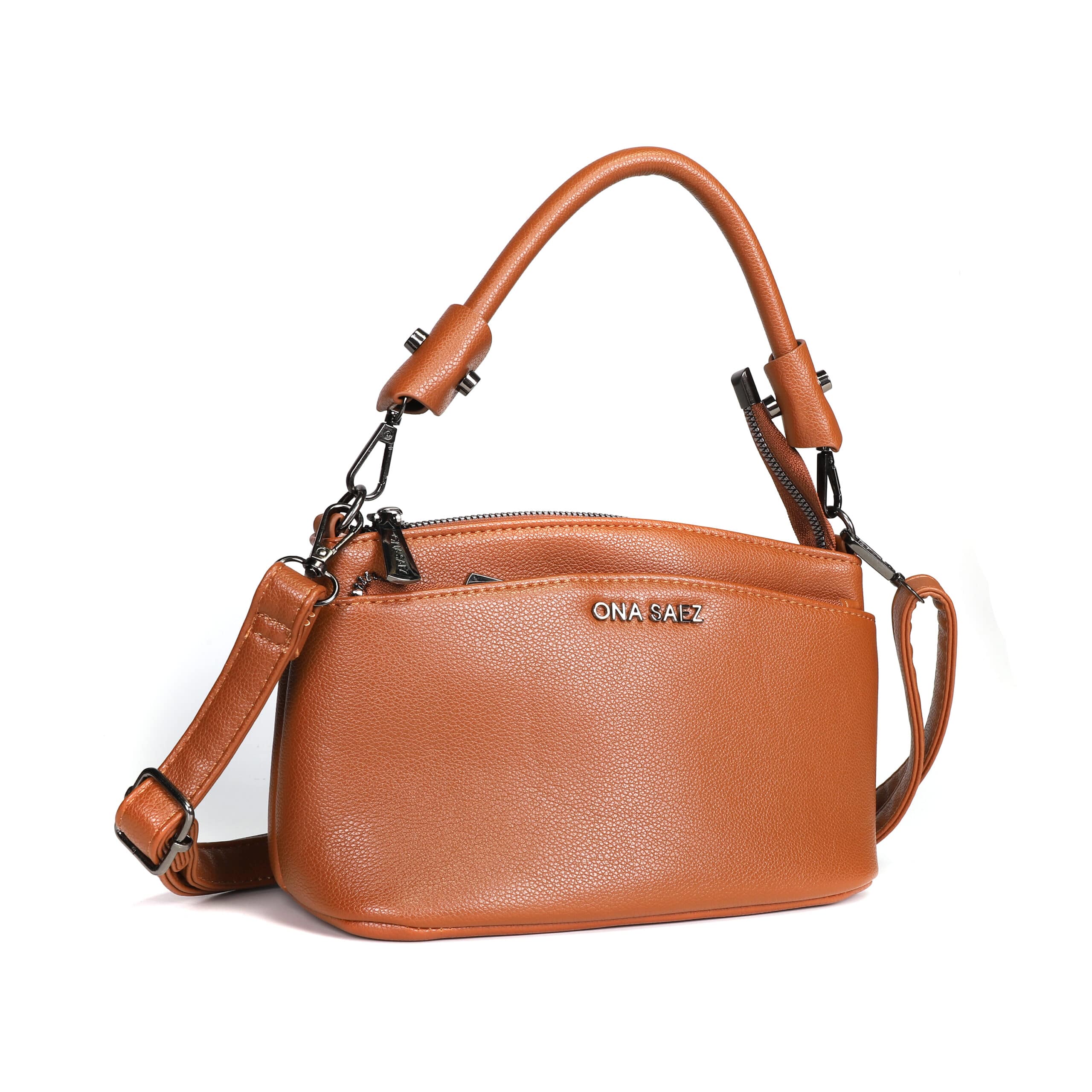Cartera de mano confeccionada en pu (simil cuero) color suela, con logo de marca grabado en el frente.