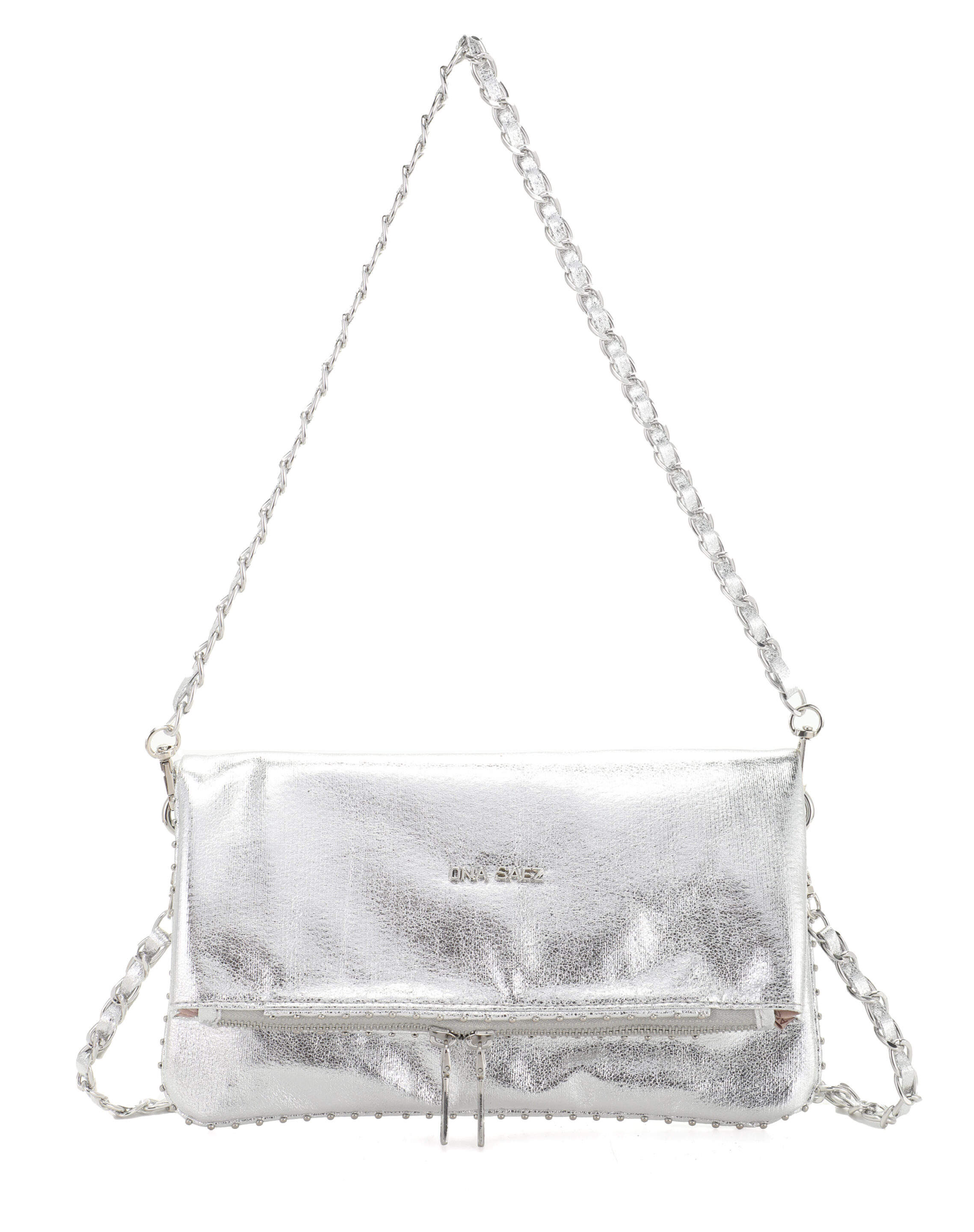 Cuenta con un compartimento principal con cierre de cremallera y doble correa, una cadena corta para mano y una desmontable para colgar al hombro.