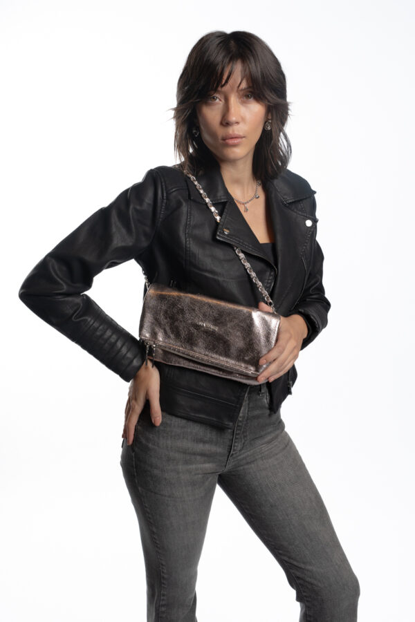 Cuenta con un compartimento principal con cierre de cremallera y doble correa, una cadena corta para mano y una desmontable para colgar al hombro.