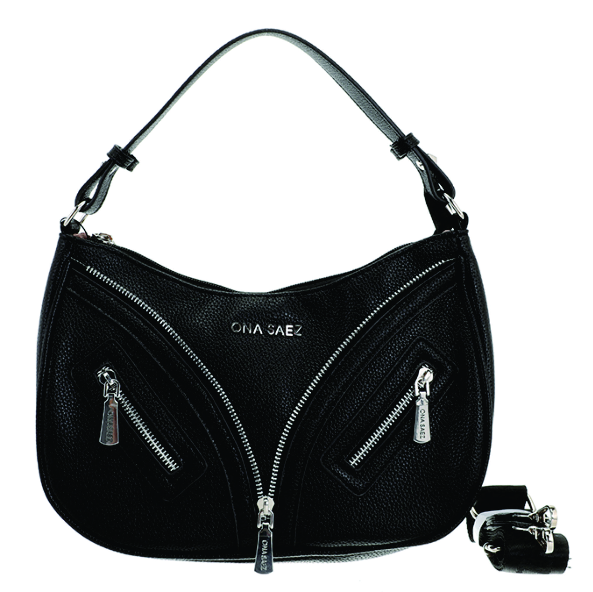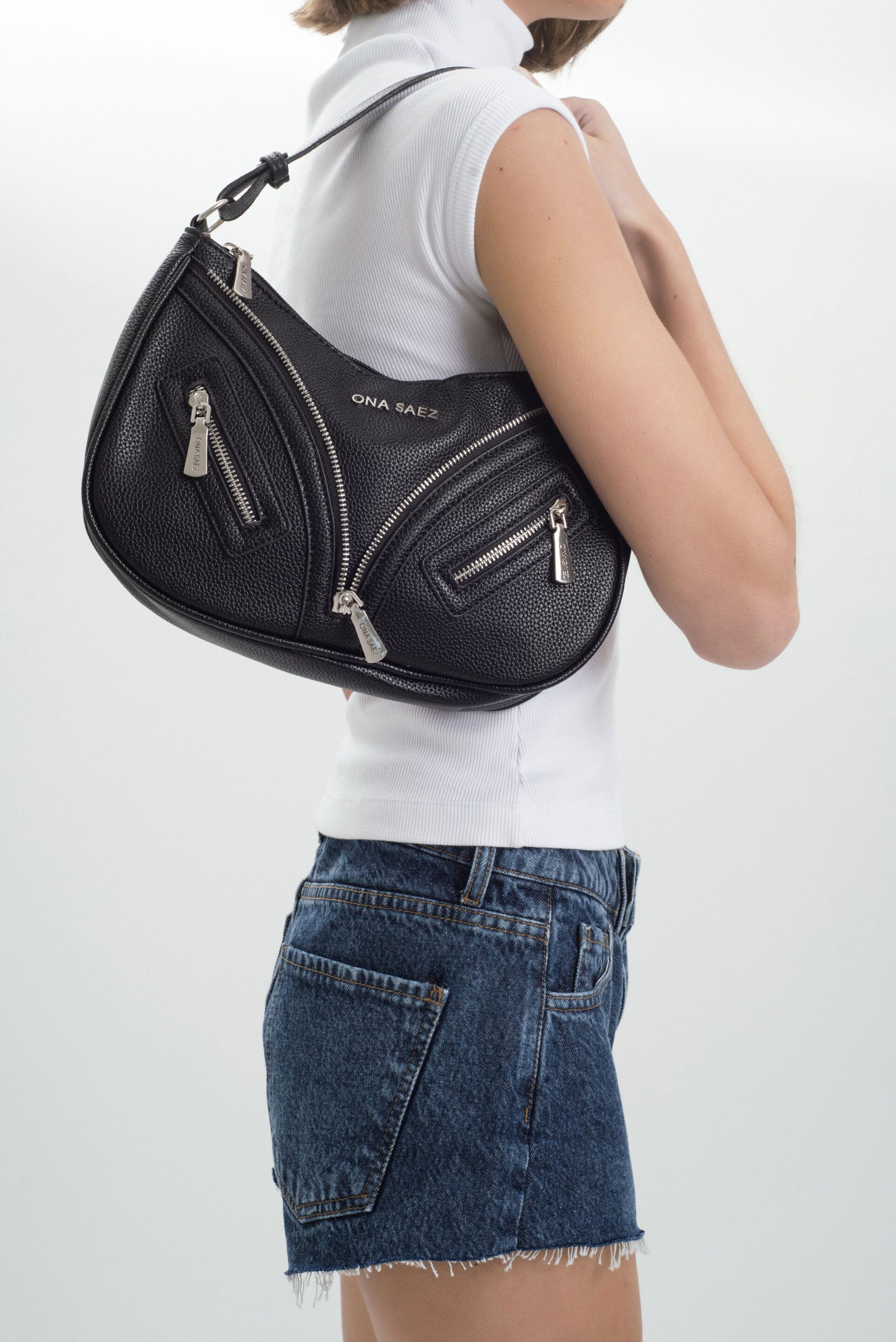Presenta dos bolsillos frontales con cierre metálico y detalles de herrajes en color plata, que aportan un toque urbano y contemporáneo.