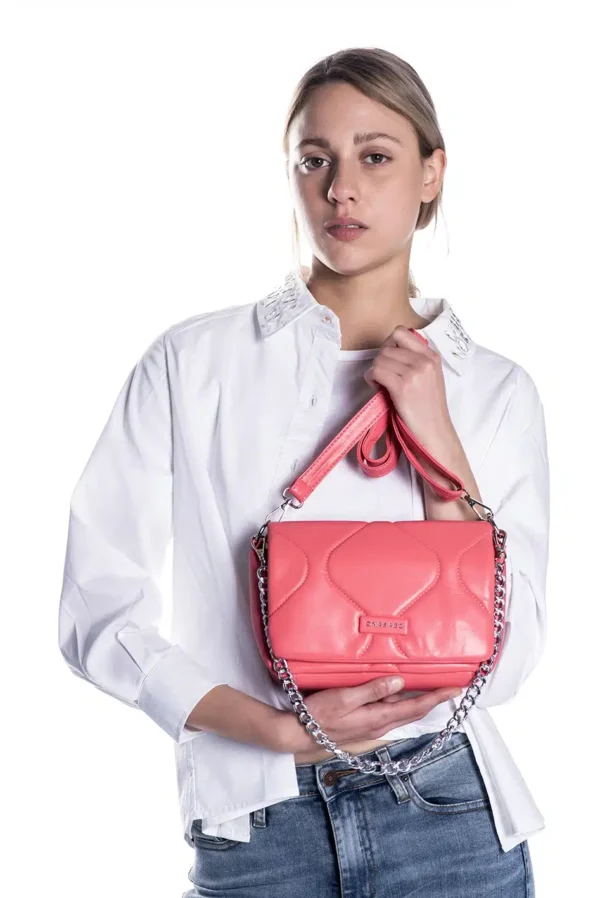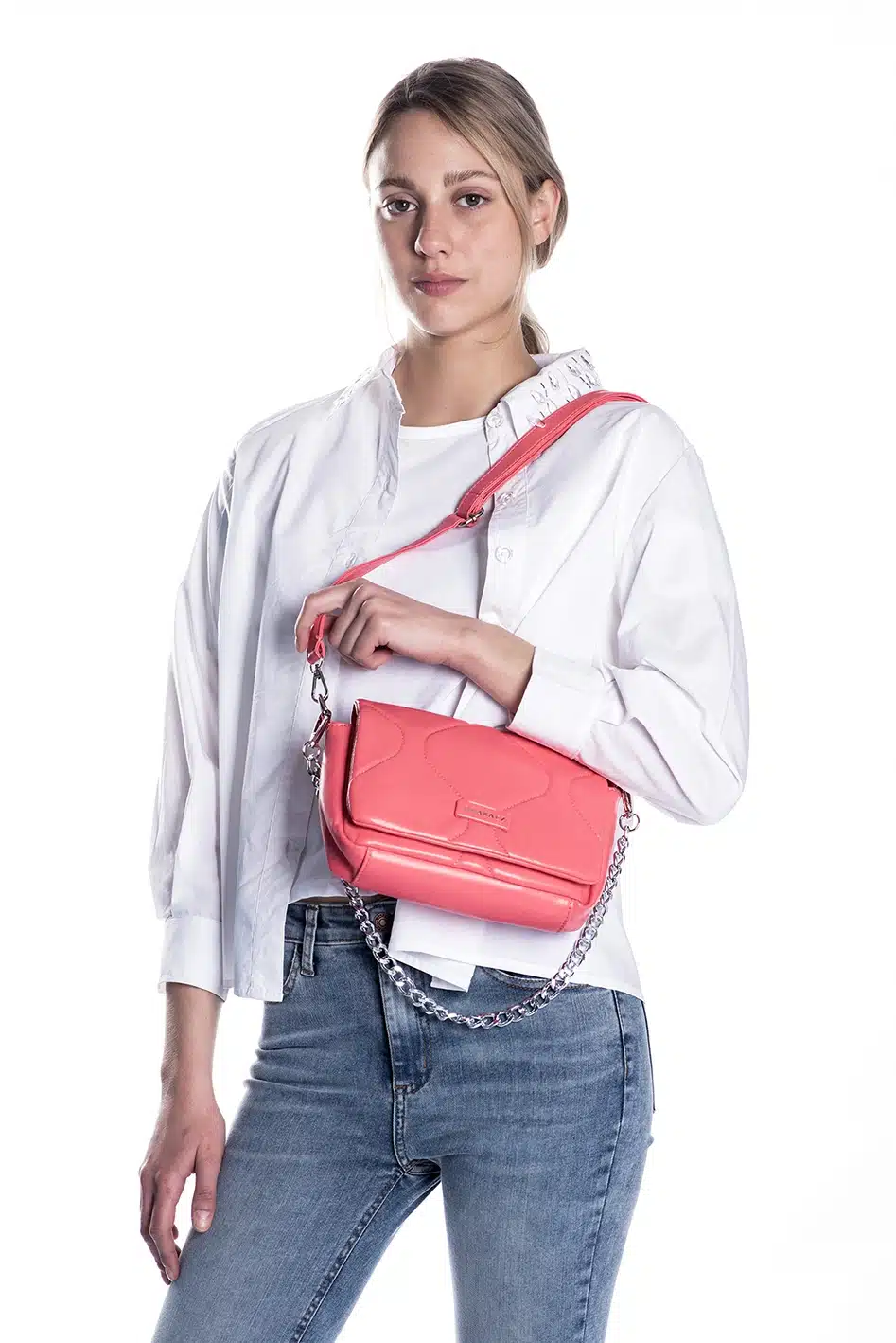 Cartera confeccionada en pu (simil cuero) color fucsia, con aplique con logo de marca en el frente.
