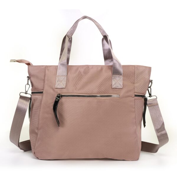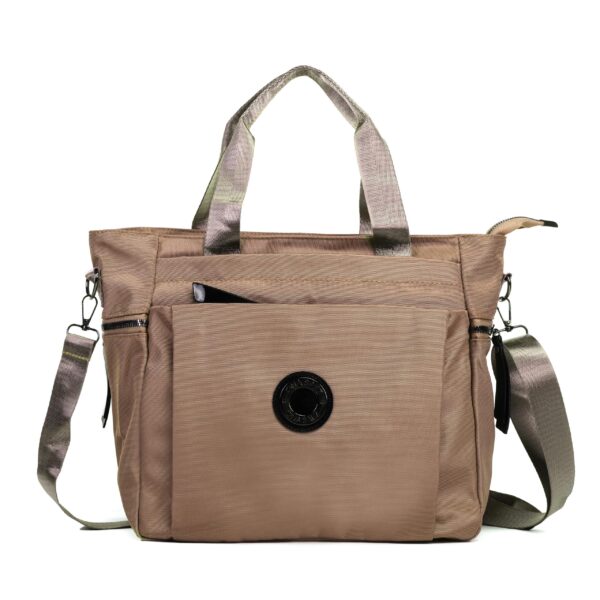 cartera confeccionada en nylon 100% color arena, con logo de marca al frente, ideal para quienes buscan un accesorio versátil para el día a día.