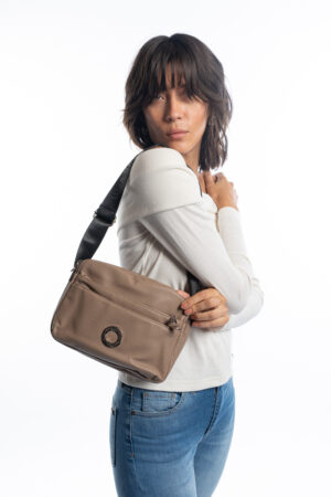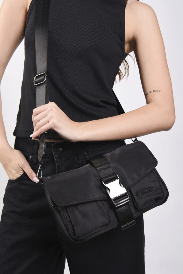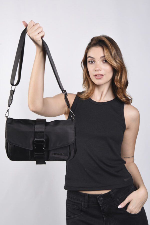 Su diseño presenta una tapa con cierre de hebilla ancha en el centro, que no solo asegura tus pertenencias, sino que aporta un toque moderno y único. la correa es totalmente ajustable, permitiéndote llevarla cruzada o al hombro, adaptándose a tus necesidades y estilo de uso.