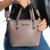 Cartera de tamaño mediano confeccionada en P U (simil cuero) color arena. Tiene un diseño moderno y funcional con cierre de cremallera, lo que permite una mejor organización.
