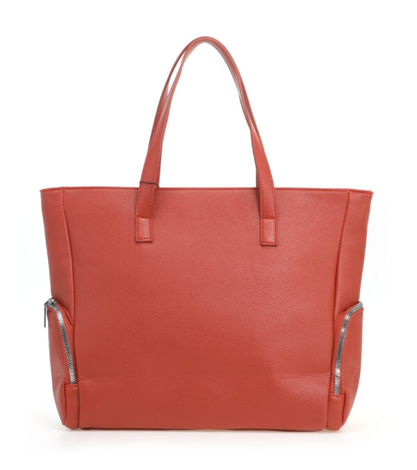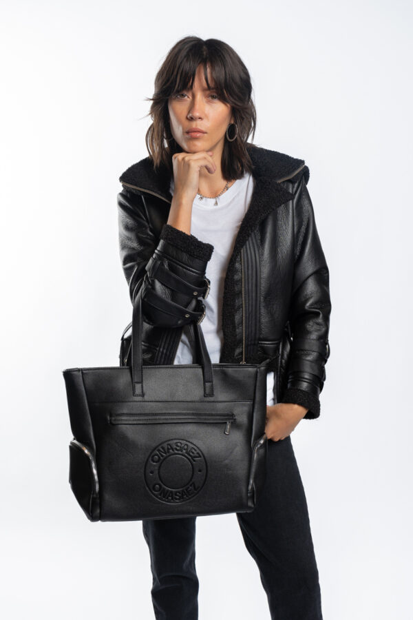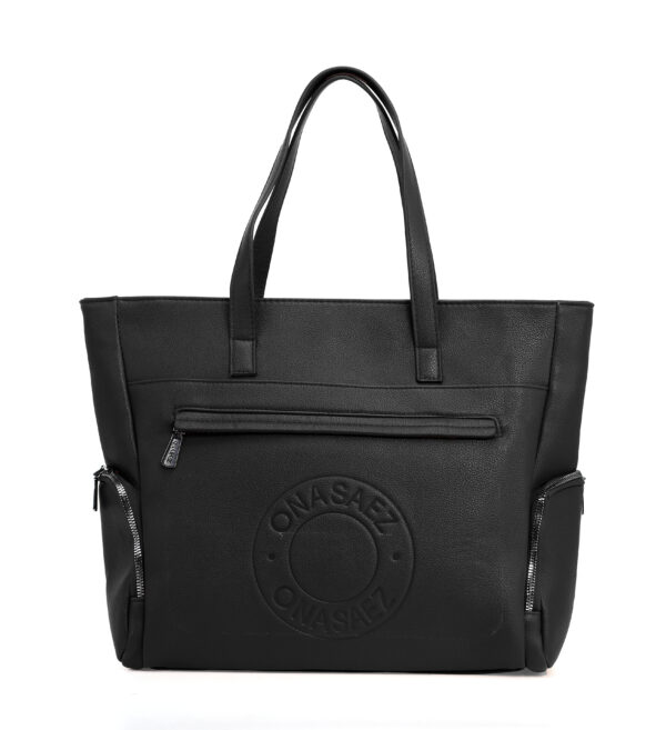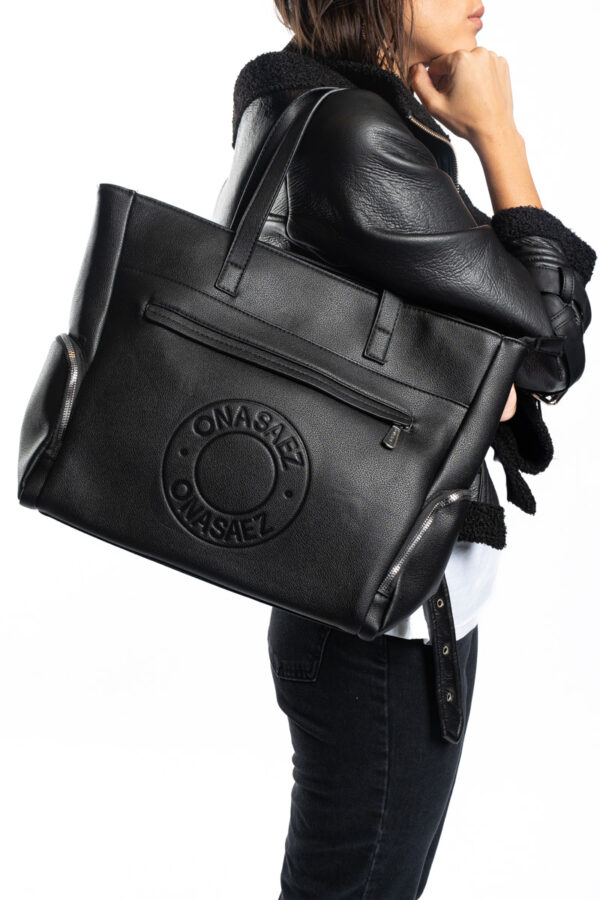 Bolso tote de eco cuero graneado con diseño estructurado y detalles minimalistas color negro. Cuenta con bolsillo frontal con cierre, cremalleras laterales funcionales y logo de marca en relieve.