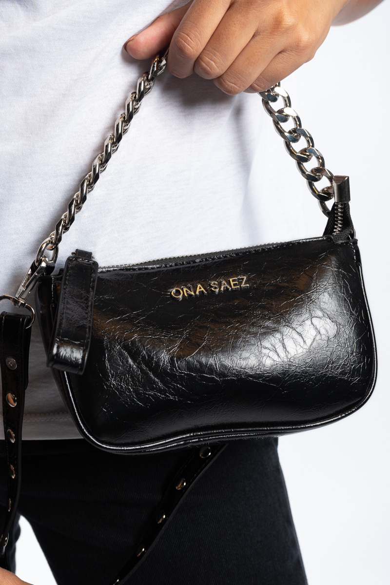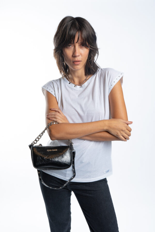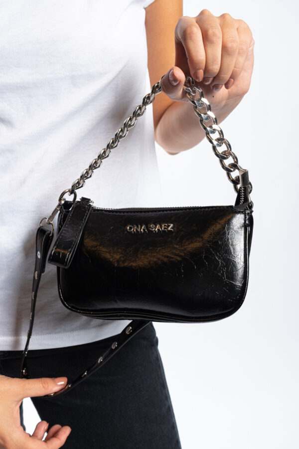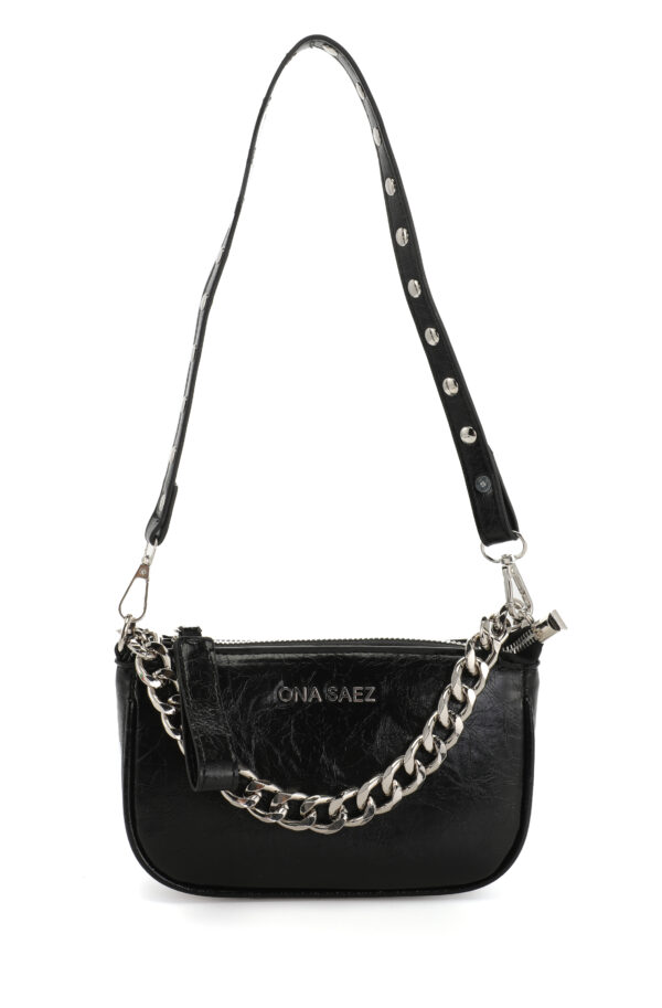 Cuenta con un compartimento principal con cierre de cremallera y doble correa, una cadena corta para mano y una desmontable para colgar al hombro con detalles de tachas.