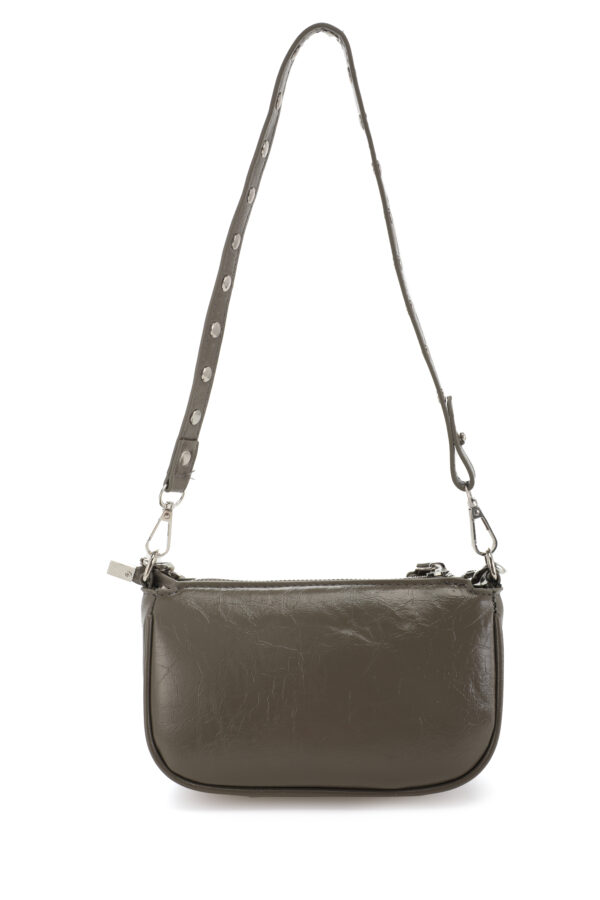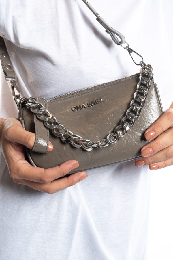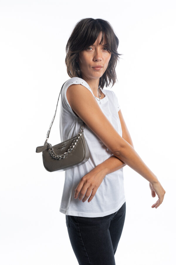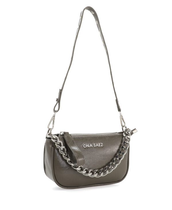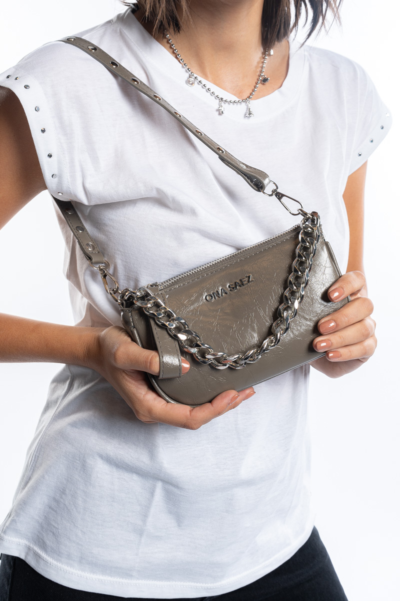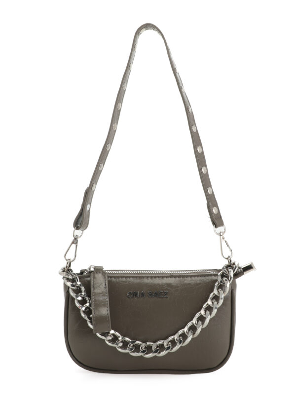 Cuenta con un compartimento principal con cierre de cremallera y doble correa, una cadena corta para mano y una desmontable para colgar al hombro con detalles de tachas.