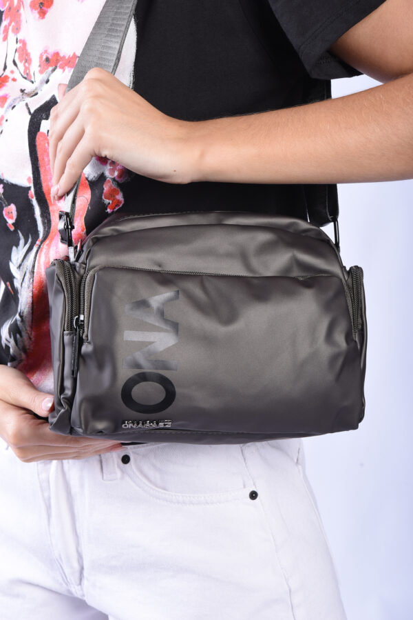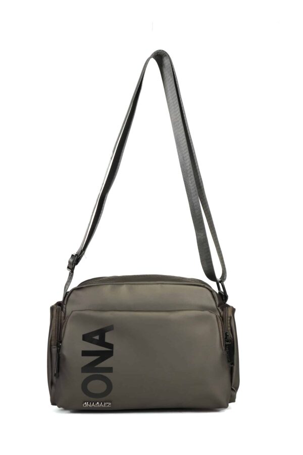 Logo de marca estampado a tono en el frente y correa ajustable para colgar al hombro, ideal para complementar looks urbanos y versátiles.