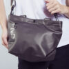 Cartera de mano confeccionada en poliéster con acabado engomado color negro, lo que le otorga una apariencia mate y una mayor resistencia al agua.