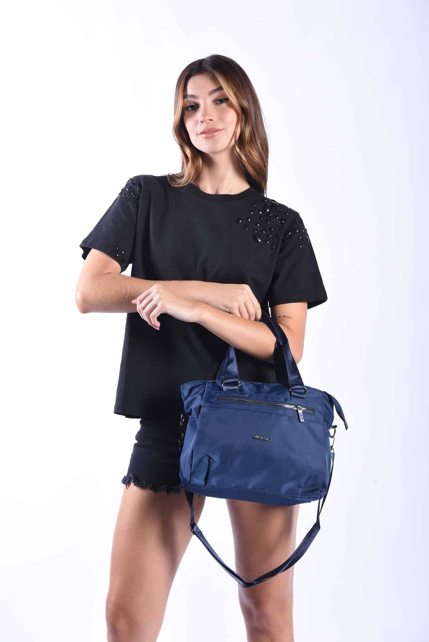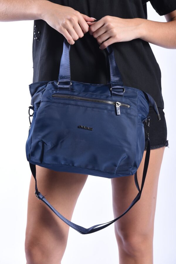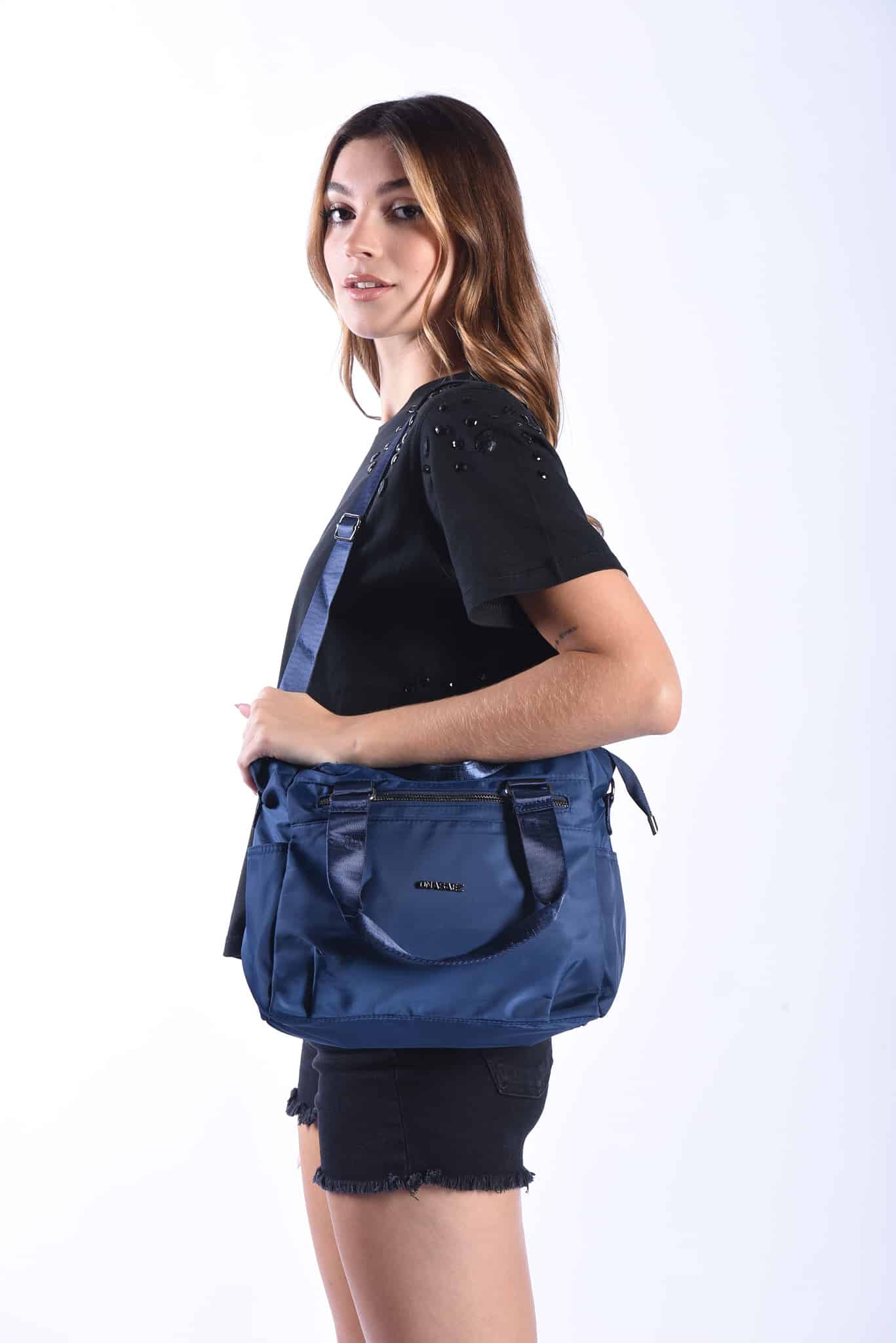 Cartera confeccionada en nylon 100% color azul, con logo de marca al frente, ideal para quienes buscan un accesorio versátil para el día a día.
