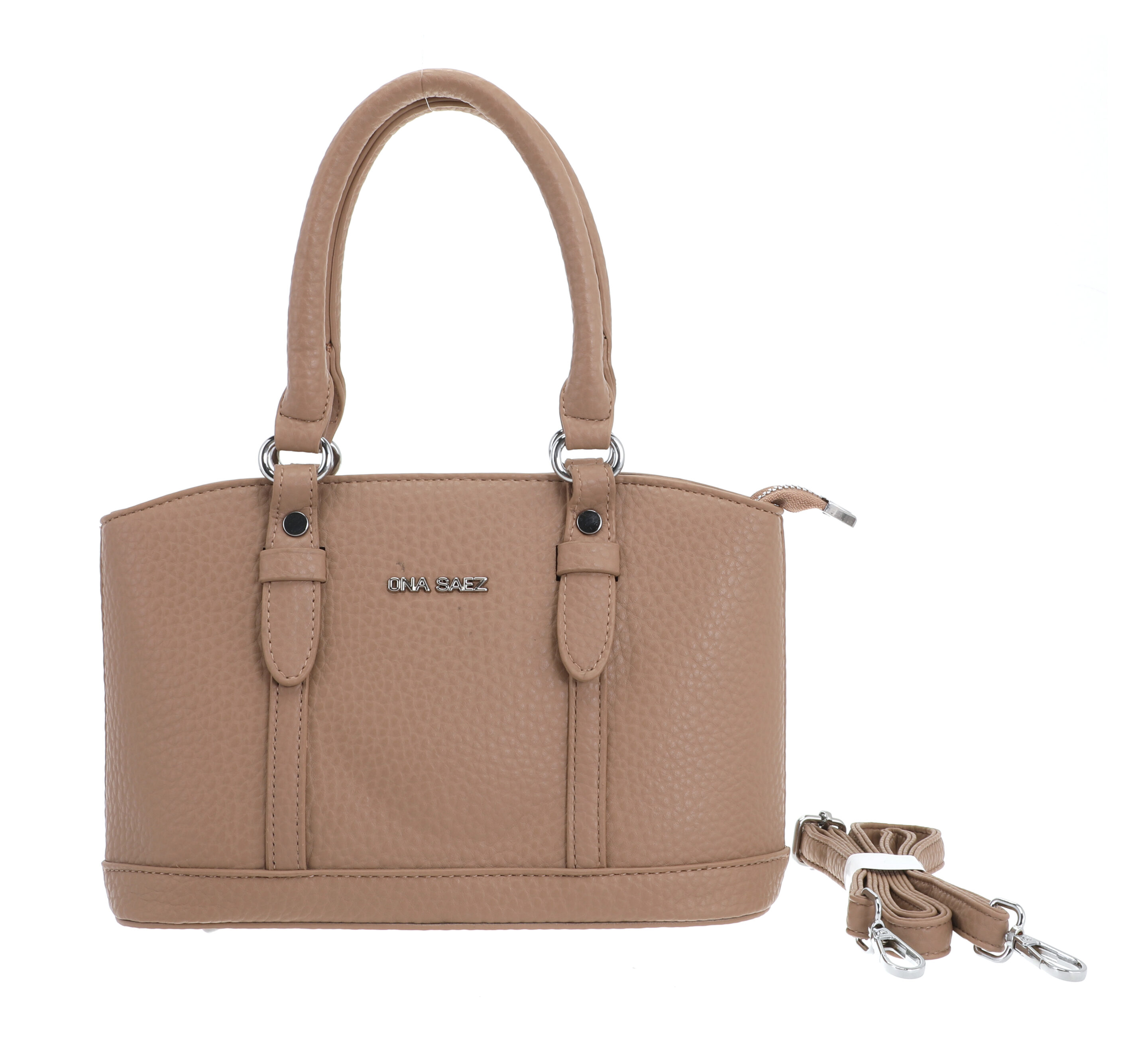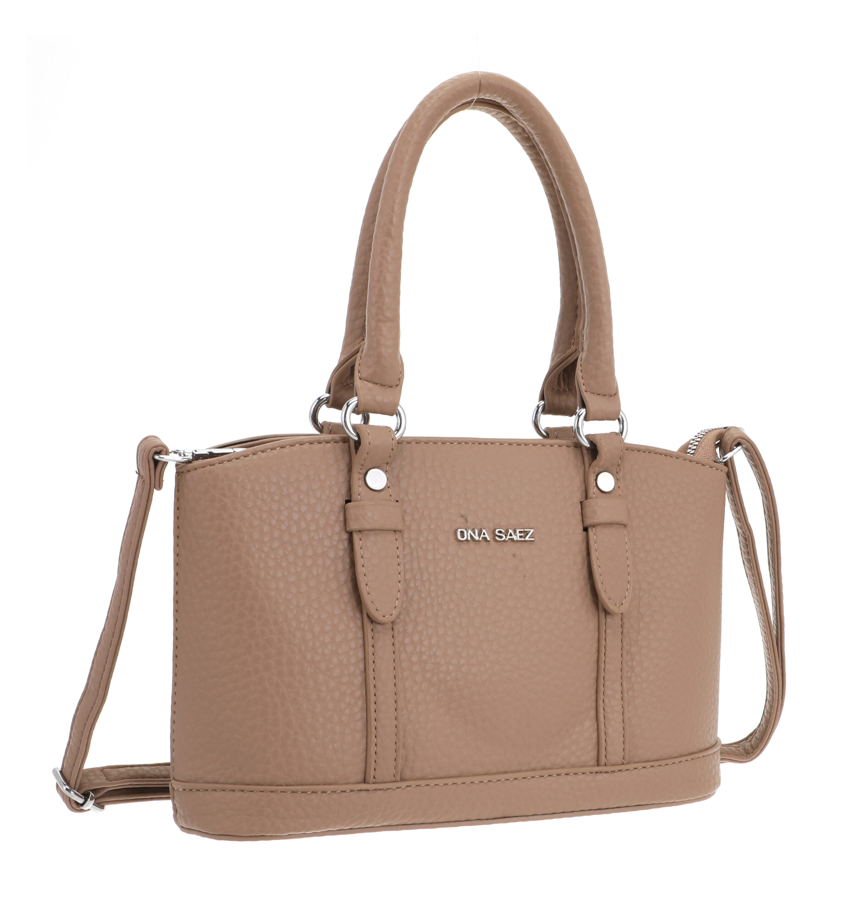 Cuenta con cierre principal metálico, base reforzada con tachas protectoras y el clásico logo ONA SAEZ aplicado al frente en metal plateado.