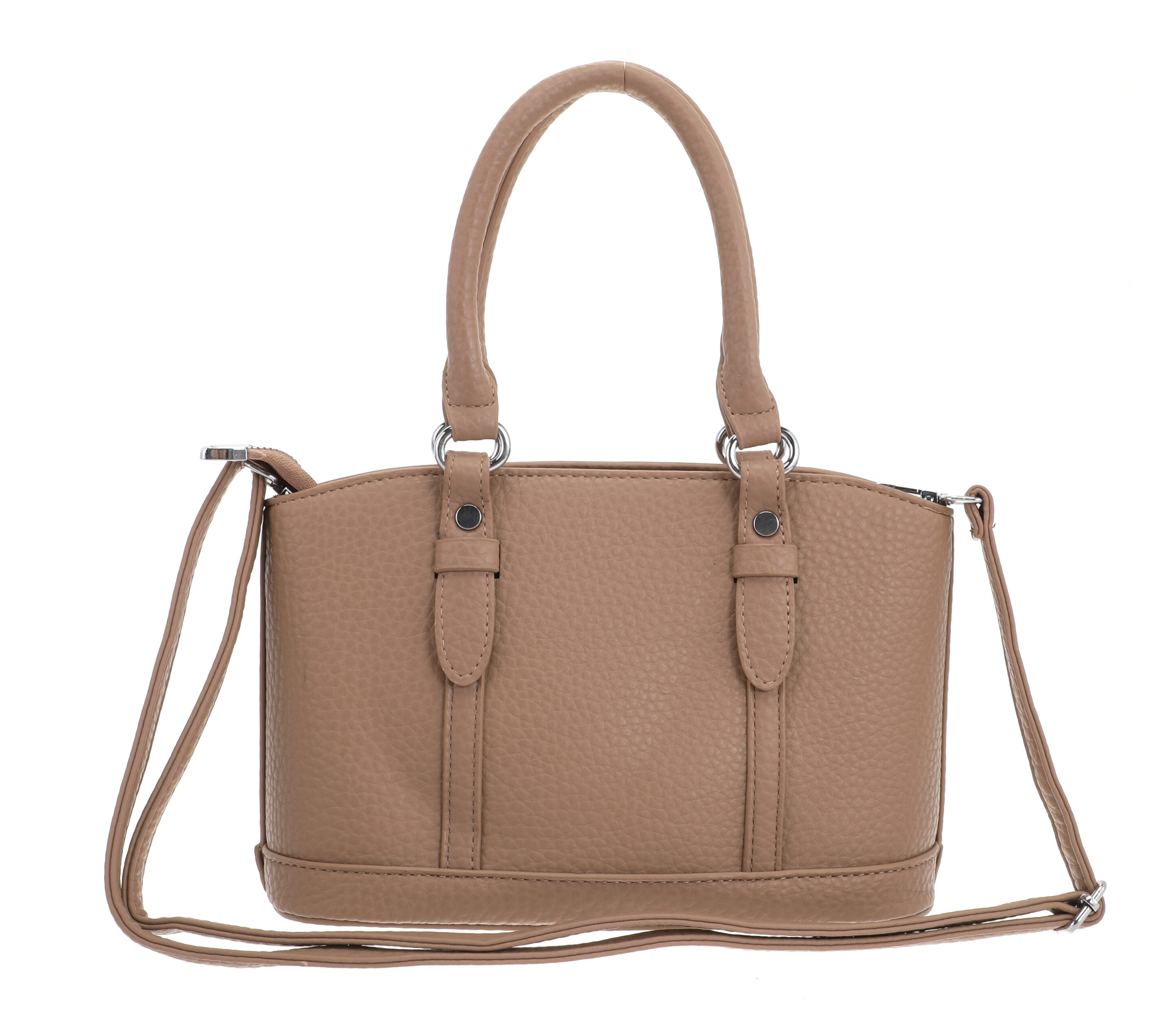 Cartera confeccionada en material símil cuero graneado color arena. Presenta una estructura semirrígida con doble manija superior y correa regulable y desmontable,