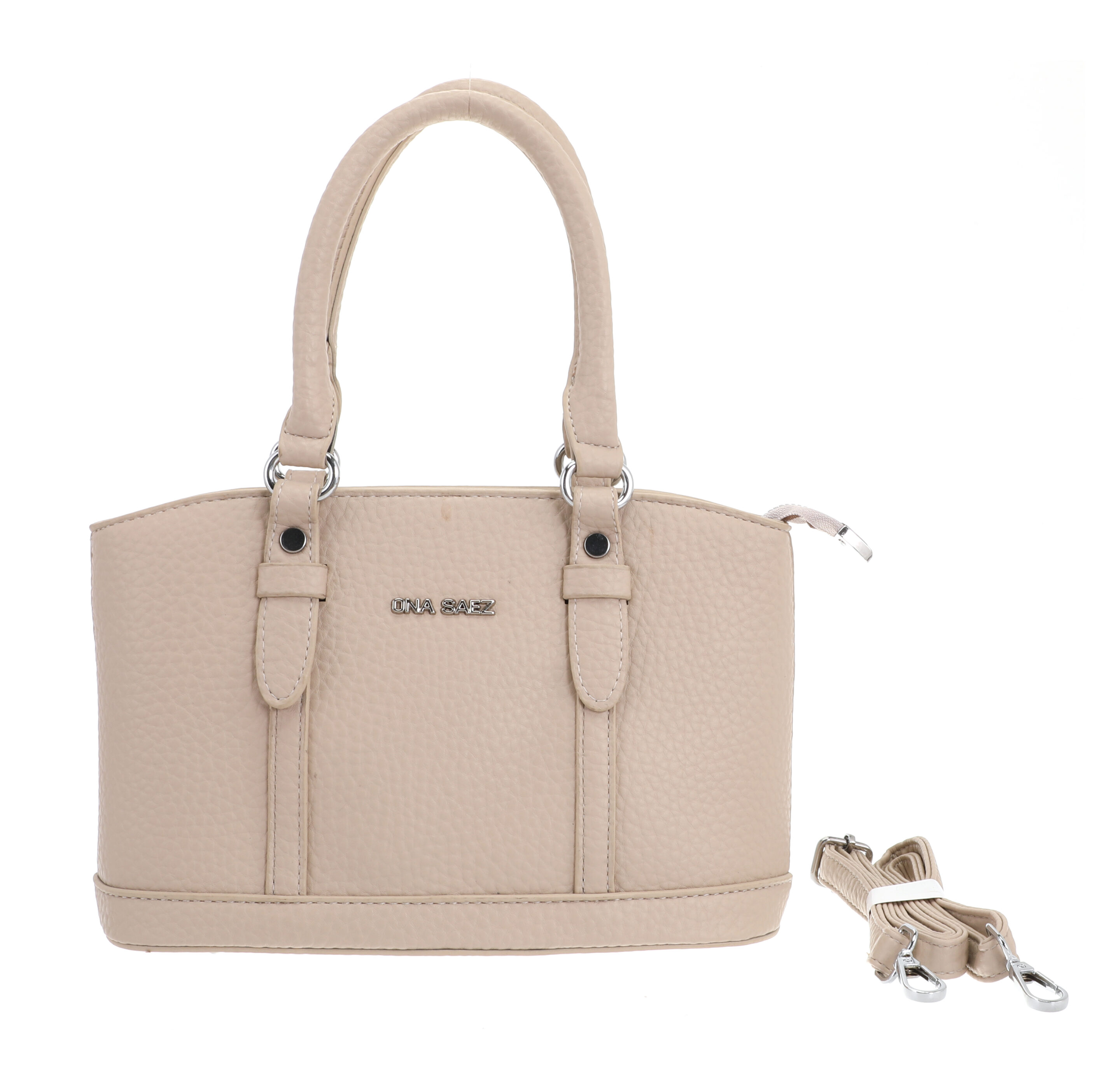 Cuenta con cierre principal metálico, base reforzada con tachas protectoras y el clásico logo ONA SAEZ aplicado al frente en metal plateado.