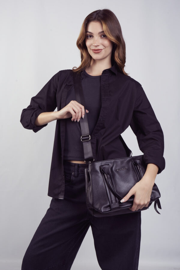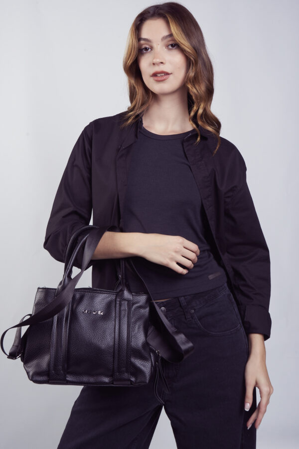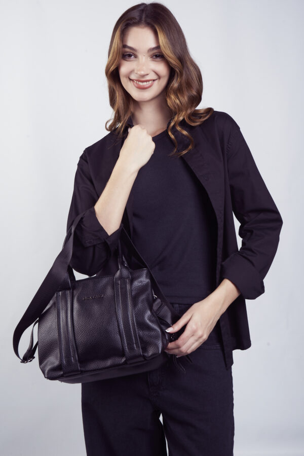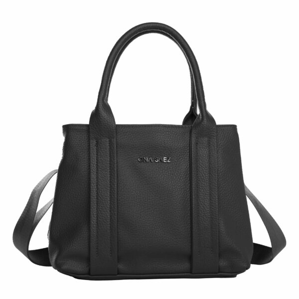 Sistema de apertura con cierre y doble correa, una corta para mano y una ajustable y removible para colgar al hombro.