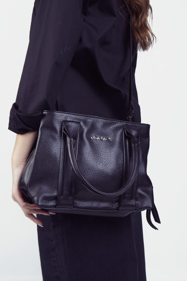 Cartera de mano confeccionada en P U (simil cuero) color negra, con logo de marca grabado en el frente.