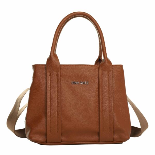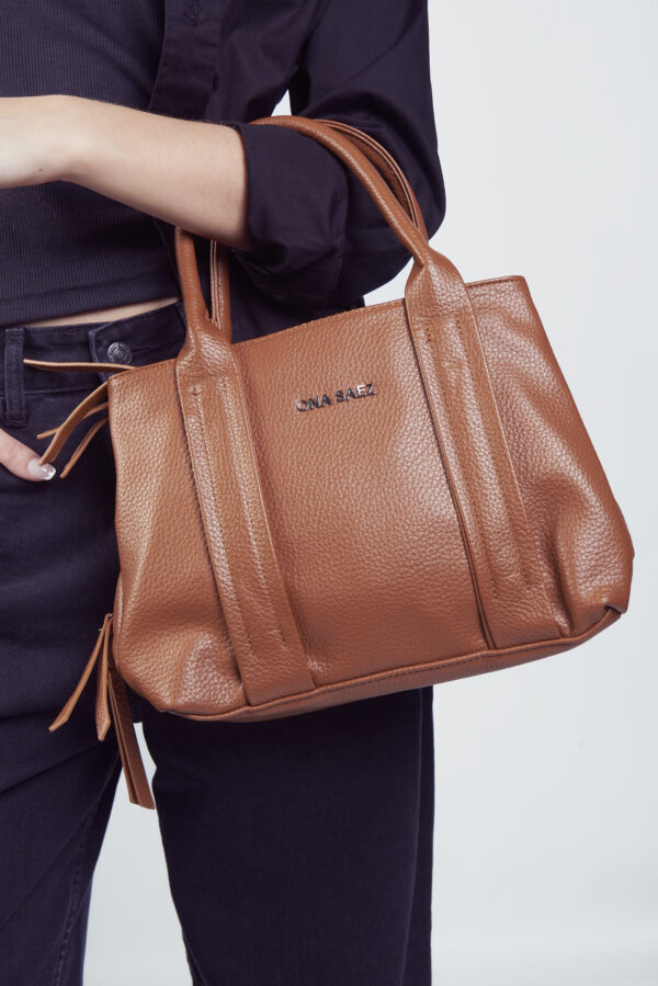 Cartera de mano confeccionada en P U (simil cuero) color suela, con logo de marca grabado en el frente.