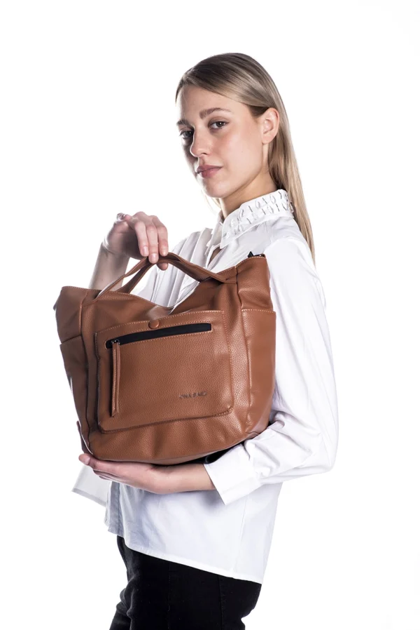 Cartera confeccionada en pu (simil cuero) color suela, con logo de marca grabado en el frente.