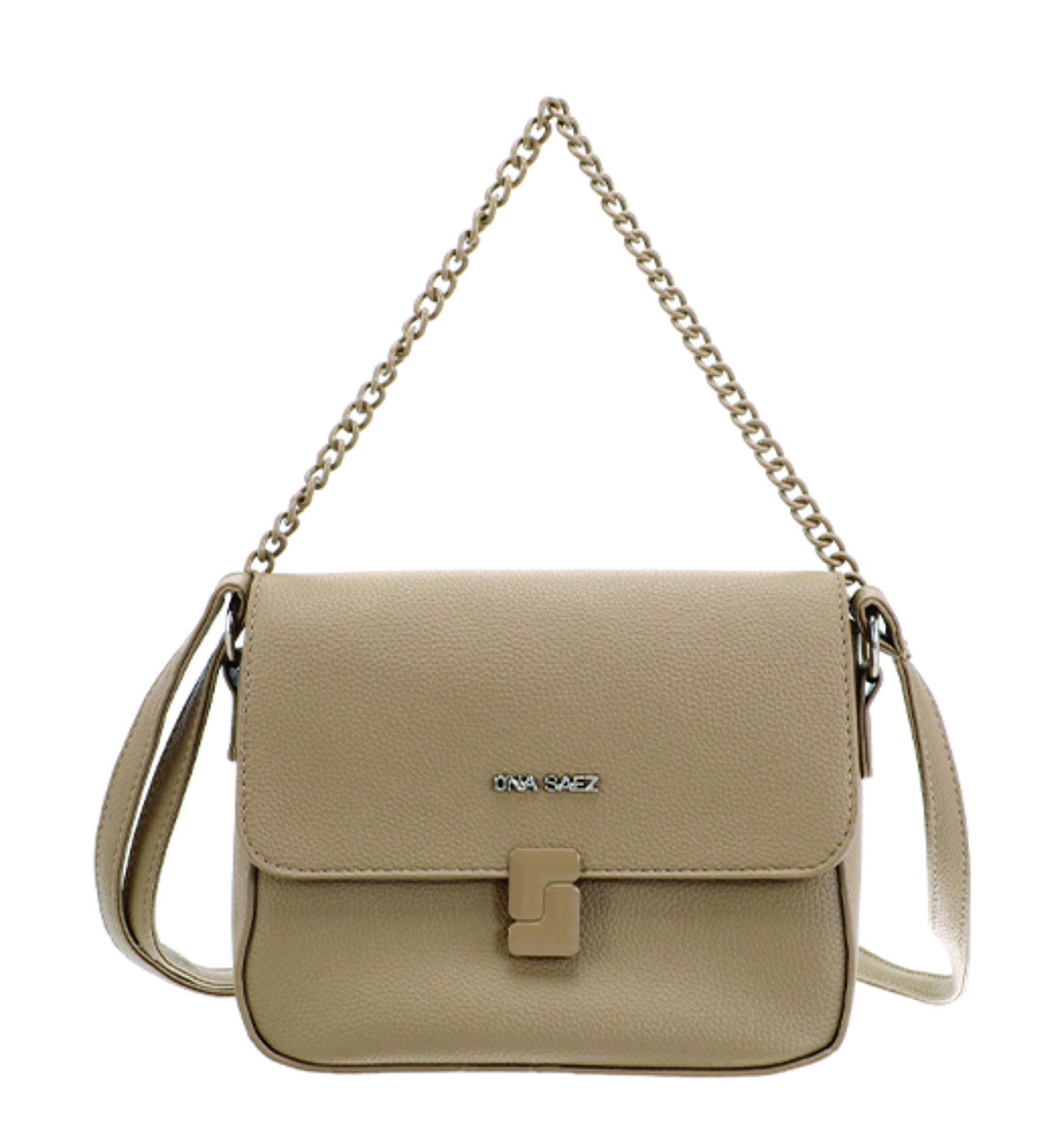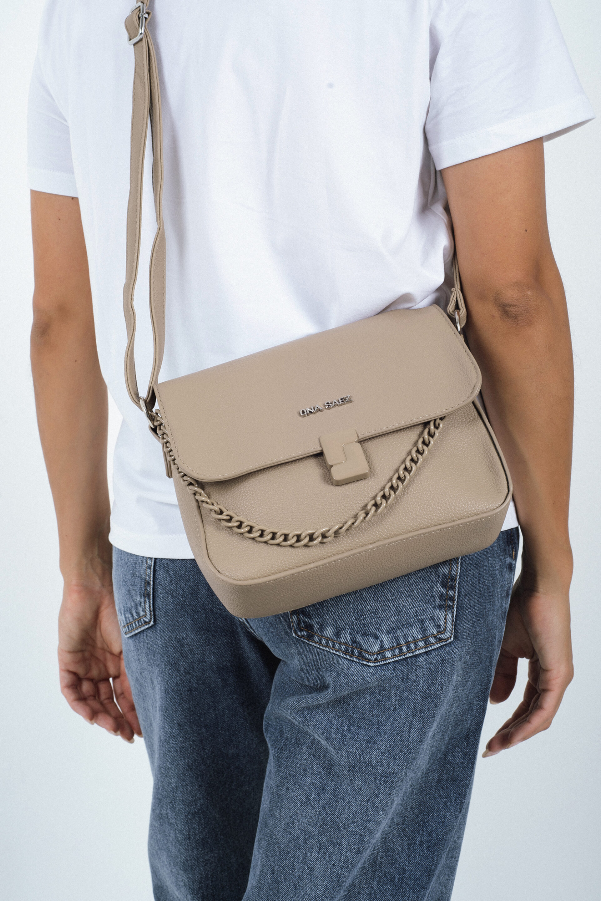 Cartera tipo bandolera flap confeccionada en material símil cuero graneado color arena. Su diseño estructurado con tapa frontal y cierre metálico con hebilla geométrica le aporta un estilo moderno y sofisticado.