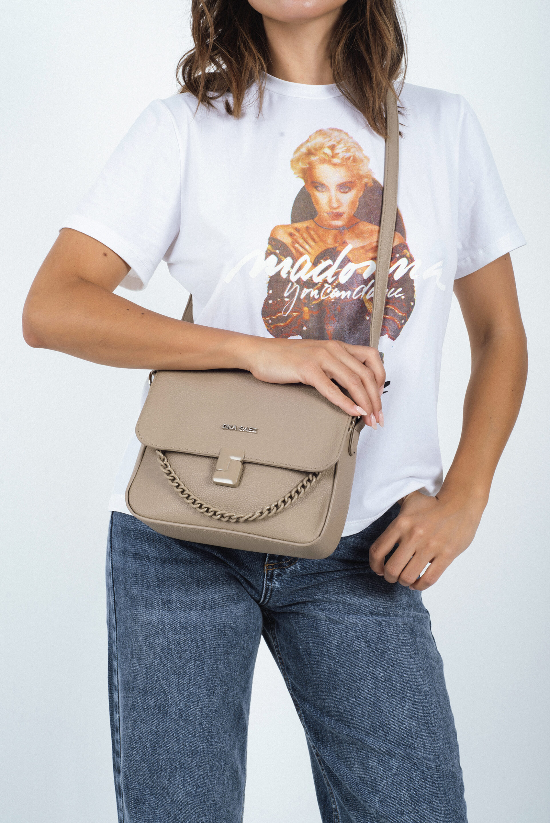 Incluye logo metálico ONA SAEZ aplicado al frente y herrajes en tono plateado que realzan su elegancia.