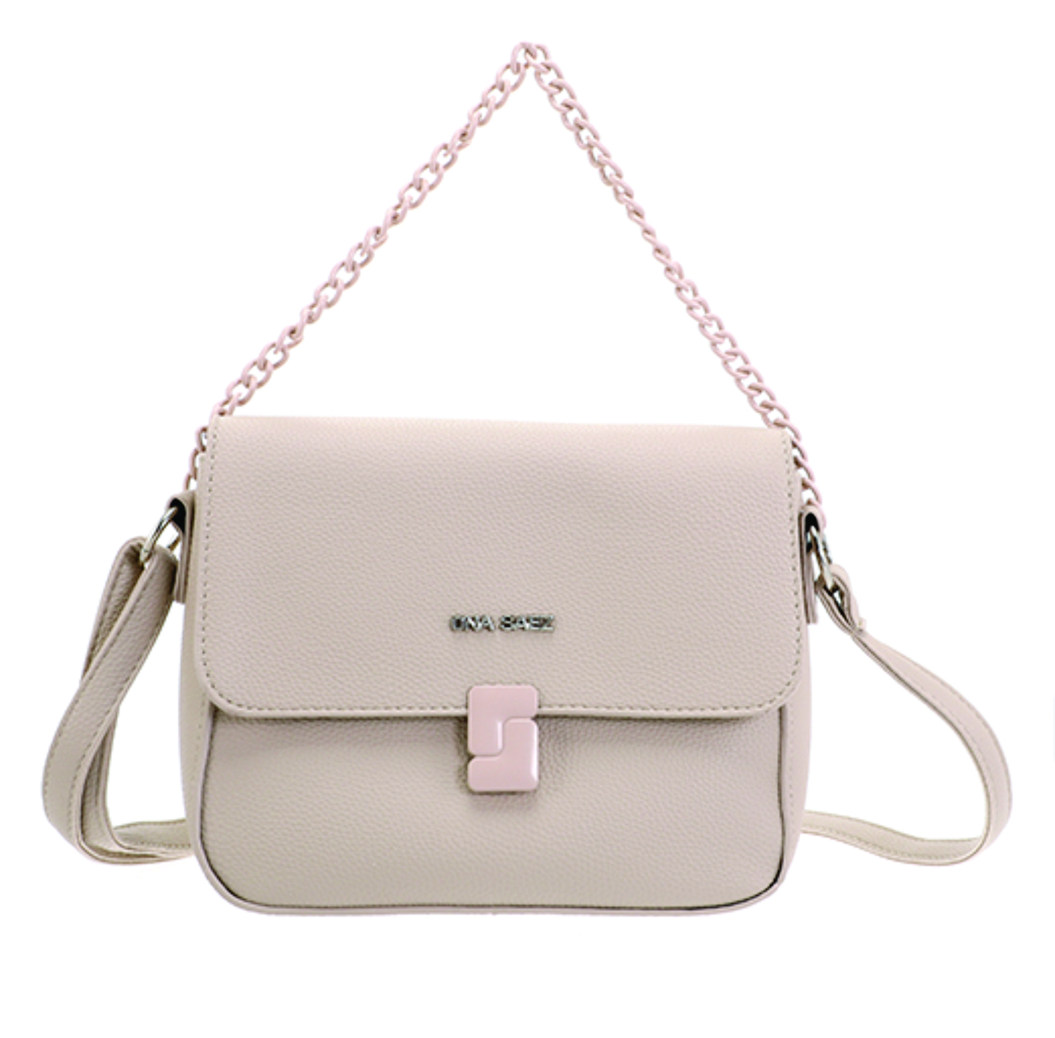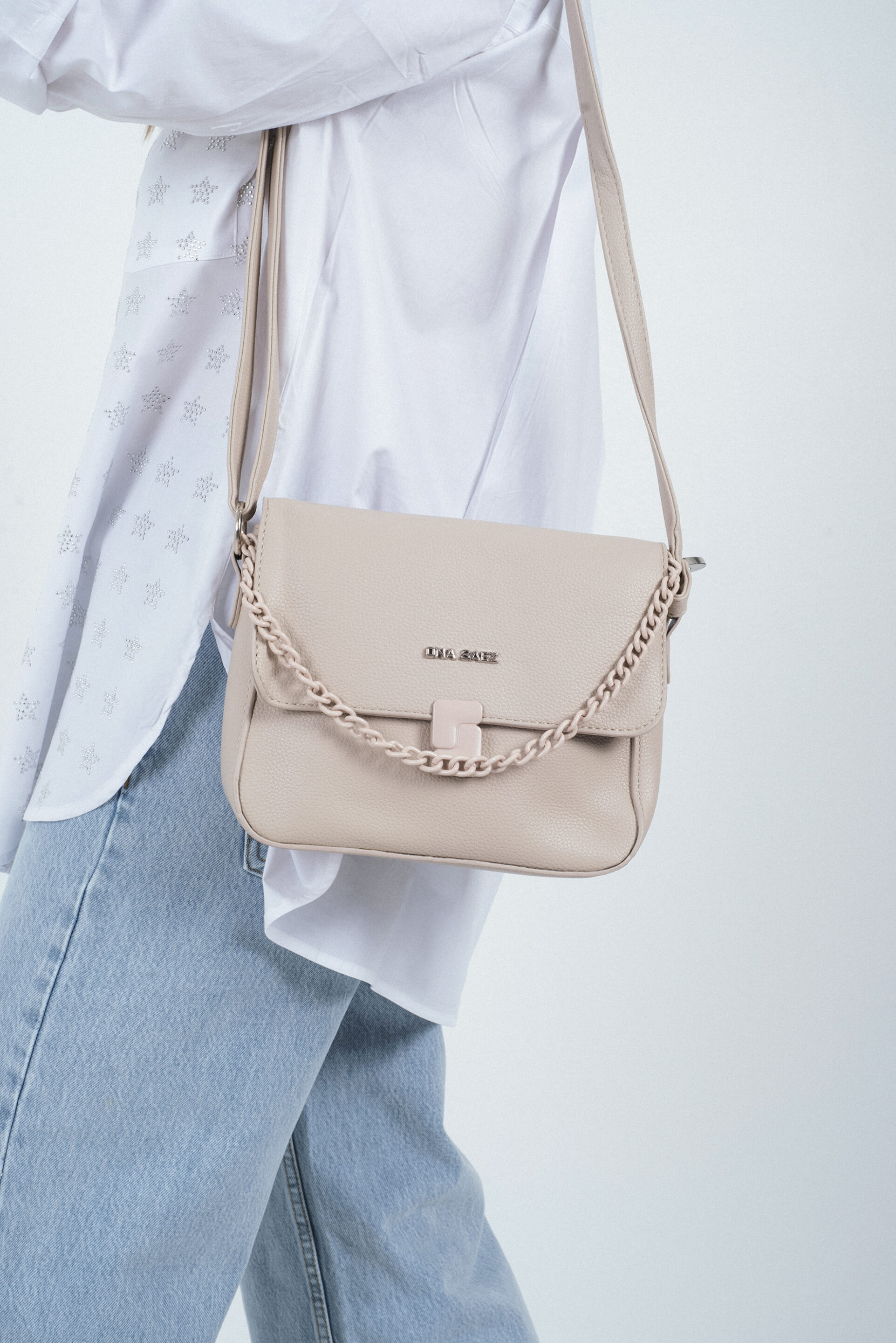 Cartera tipo bandolera flap confeccionada en material símil cuero graneado color crudo. Su diseño estructurado con tapa frontal y cierre metálico con hebilla geométrica le aporta un estilo moderno y sofisticado.