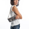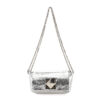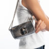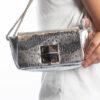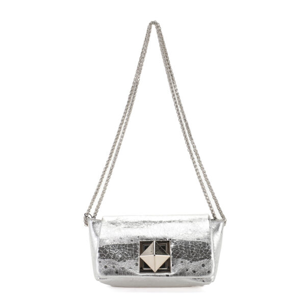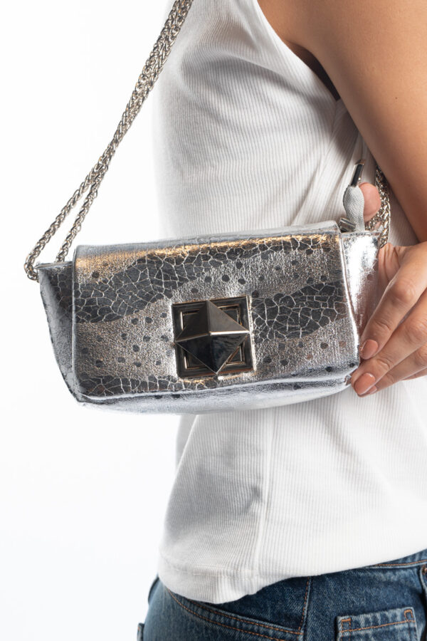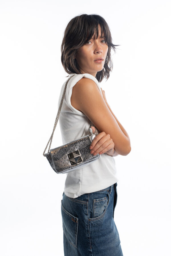Diseño estructurado con textura irregular que aporta un efecto sofisticado y moderno. Cierre frontal con broche geométrico metálico en forma de pirámide y correa de cadena plateada para llevar al hombro o cruzado.