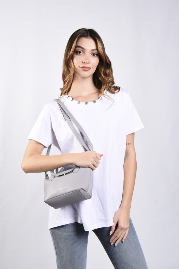 Cartera de mano confeccionada en P U (simil cuero) color cemento, con logo de marca grabado en el frente.